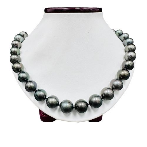 One graduated single strand pearl necklace 18.2" princess length, knotted with a tongue clasp & foldover safety containing 31 Tahitian pearls, 14.3mm to 12.1mm in size. The pearls are black in color, green overtone with a very good luster, round to near round, and mostly clean with very good matching. The featured pearl necklace has a 14KT white gold rectangular wave motif clasp. Graded on the strand.Tahitian cultured pearls form in the Pinctada Margaritifera oysters. This species is native to the central and South Pacific Ocean but is generally raised in lagoons by pearl farmers. Tahitian cultured pearls take between two to four years to form. Eighteen bezel set round brilliant cut diamonds, measuring 1.60 - 1.55 x 0.98mm (depth est.) approximate total weight of 18 Stones = 0.28ct. Graded in the setting. Color G - H Clarity VS-2 to SI-1 Cut Very Good Fifty-Four prong set single cut diamonds, measuring 1.20 - 1.10 x 0.69mm (depth est.) approximate total weight of 54 Stones = 0.30ct. Graded in the setting. Color G - I Clarity SI-1 to I-1 Cut Good Total Weight of Diamonds 0.58ct. Total Weight of 105.70gm