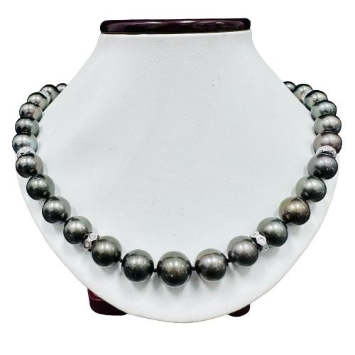 One graduated single strand pearl necklace 18.5" princess length, knotted with a tongue clasp & foldover safety containing 35 Tahitian pearls, 13.8mm to 11.1mm in size. The pearls are black in color, green overtone with a very good luster, round to near round, and lightly blemished with very good matching. The featured pearl necklace has a 14KT white gold bow motif clasp encrusted with diamonds and features 6 diamond encrusted rondels. Graded on the strand.Tahitian cultured pearls form in the Pinctada Margaritifera oysters. This species is native to the central and South Pacific Ocean but is generally raised in lagoons by pearl farmers. Tahitian cultured pearls take between two to four years to form. Forty-Six prong set single cut diamonds, measuring 1.10 - 1.00 x 0.65mm (depth est.) approximate total weight of 46 Stones = 0.20ct. Graded in the setting. Color H - I Clarity SI-1 to I-1 Cut Good Thirty-Six bezel set single cut diamonds, measuring 1.20 - 1.10 x 0.71mm (depth est.) approximate total weight of 36 Stones = 0.20ct. Graded in the setting. Color H - I Clarity SI-1 to I-1 Cut Good Total Weight of Diamonds 0.40ct. Total Weight of 95.30gm