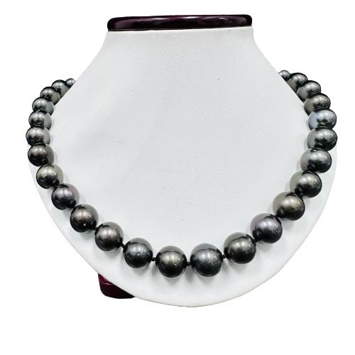 One graduated single strand pearl necklace 18.5" princess length, knotted with a tongue clasp & foldover safety containing 35 Tahitian pearls, 13.4mm to 11.0mm in size. The pearls are black in color, green overtone with a good luster, round to near round, and lightly blemished with very good matching. The featured pearl necklace has a 14KT white gold rounded floral motif clasp encrusted with diamonds. Graded on the strand.Tahitian cultured pearls form in the Pinctada Margaritifera oysters. This species is native to the central and South Pacific Ocean but is generally raised in lagoons by pearl farmers. Tahitian cultured pearls take between two to four years to form. One bezel set round brilliant cut diamond, measuring 2.30 - 2.25 x 1.41mm (depth est.) approximate weight of 0.05ct. Graded in the setting. Color H Clarity SI-1 Cut Very Good Thirty-Four prong set single cut diamonds, measuring 1.10 - 1.00 x 0.65mm (depth est.) approximate total weight of 34 Stones = 0.15ct. Graded in the setting. Color H - I Clarity SI-1 to I-1 Cut Good Total Weight of Diamonds 0.20ct. Total Weight of 91.50gm