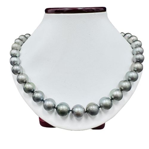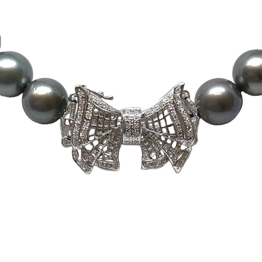 One graduated single strand pearl necklace 18.5" princess length, knotted with a tongue clasp & foldover safety containing 35 Tahitian pearls, 13.8mm to 11.0mm in size. The pearls are silver in color, green overtone with a good luster, round to near round, and lightly blemished with very good matching. The featured pearl necklace has a 14KT white gold bow motif clasp encrusted with diamonds. Graded on the strand.Tahitian cultured pearls form in the Pinctada Margaritifera oysters. This species is native to the central and South Pacific Ocean but is generally raised in lagoons by pearl farmers. Tahitian cultured pearls take between two to four years to form. Sixty-Four prong set single cut diamonds, measuring 1.10 - 1.00 x 0.65mm (depth est.) approximate total weight of 64 Stones = 0.28ct. Graded in the setting. Color H - J Clarity SI-1 to I-1 Cut Good Total Weight of Diamonds 0.28ct. Total Weight of 95.00gm