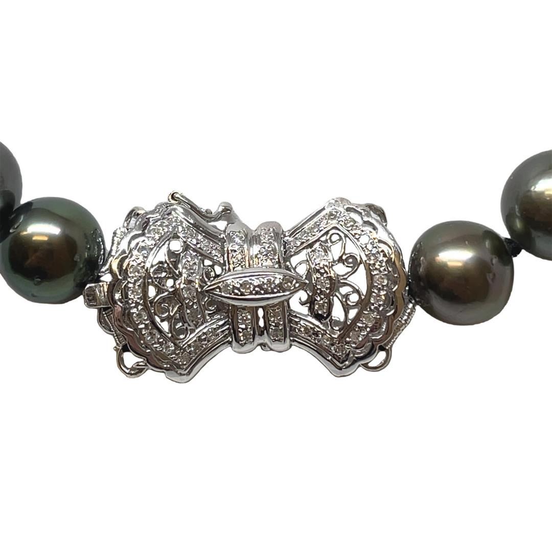 One graduated single strand pearl necklace 18.5" princess length, knotted with a tongue clasp & foldover safety containing 37 Tahitian pearls, 12.7mm to 10.0mm in size. The pearls are black in color, green overtone with a very good luster, round to near round, and lightly blemished with very good matching. The featured pearl necklace has a 14KT white gold bow motif clasp encrusted with diamonds and features 4 diamond encrusted rondels. Graded on the strand.Tahitian cultured pearls form in the Pinctada Margaritifera oysters. This species is native to the central and South Pacific Ocean but is generally raised in lagoons by pearl farmers. Tahitian cultured pearls take between two to four years to form. Seventy-Six prong set single cut diamonds, measuring 1.10 - 1.00 x 0.65mm (depth est.) approximate total weight of 76 Stones = 0.35ct. Graded in the setting. Color H - I Clarity SI-1 to I-1 Cut Good Total Weight of Diamonds 0.35ct. Total Weight of 83.10gm