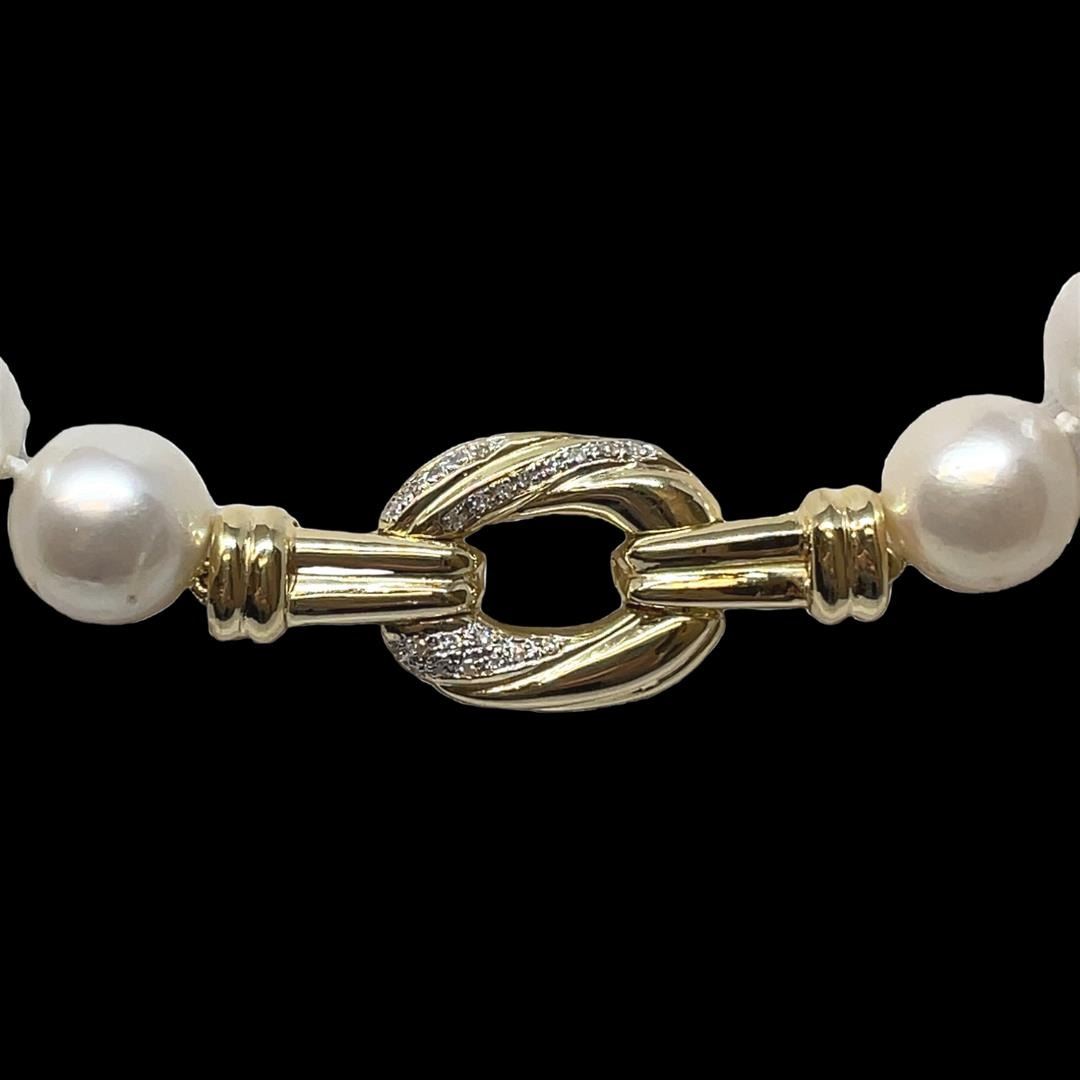One graduated single strand pearl necklace 18.5" princess length, knotted with a tongue clasp & foldover safety containing 33 south sea cultured pearls, 14.2mm to 12.0mm in size. The pearls are white in color with a good luster, round to near round, and moderately blemished with very good matching. The featured pearl necklace has a 14KT yellow gold oval motif clasp with snap locking foldunder safety, encrusted with diamonds and four diamond set rondels. Graded on the strand.South Sea cultured pearls are farmed in the oceans surrounding Australia, Indonesia, the Philippines and the southern coast of China. The main source of Australian South Sea pearls lies in the northwest on the Kimberly coast. South Sea cultured pearls are formed in the Pinctada Maxima oyster, which is the world's largest pearl cultivating oyster and is native to the South China Sea, the Java, the Indian and the Pacific Oceans. There are two varieties of the Pinctada Maxima oyster: the Gold Lipped oyster which produces golden colored pearls, and the Silver Lipped oyster which produces white colored pearls. These pearls take between two to three years to grow and have a unique nacre due to the fast moving and clean waters of the South Seas. Forty-Seven prong set single cut diamonds, measuring 1.10 - 1.00 x 0.65mm (depth est.) approximate total weight of 47 Stones = 0.20ct. Graded in the setting. Color H - I Clarity SI-2 to I-1 Cut Good Total Weight of Diamonds 0.20ct. Total Weight of 111.30gm