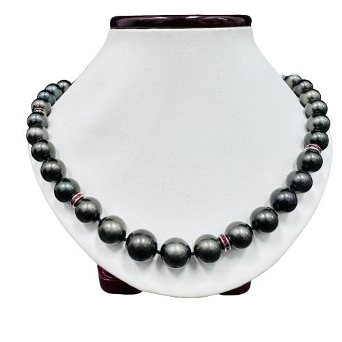 One graduated single strand pearl necklace 18.2" princess length, knotted with a tongue clasp & foldover safety containing 37 Tahitian pearls, 13.9mm to 10.1mm in size. The pearls are dark black in color, green overtone with a good luster, round to near round, and lightly blemished with excellent matching. The featured pearl necklace has a 14KT yellow gold oval floral motif clasp and 4 ruby set rondels. Graded on the strand.Tahitian cultured pearls form in the Pinctada Margaritifera oysters. This species is native to the central and South Pacific Ocean but is generally raised in lagoons by pearl farmers. Tahitian cultured pearls take between two to four years to form. One bezel set oval modified brilliant cut natural ruby, measuring 4.20 x 3.35 x 2.28mm, (depth est.) approximate weight of 0.30ct., clarity is slightly included, medium, strong, orangy red color, (GIA oR 5/5), cut is very good. Transmitting light with a minimum of distortion, transparent. Colored gemstones are presumed to have been subjected to commonly used enhancement processes. Graded in the setting. Forty-four channel set square step cut natural rubies, measuring 1.70 x 1.65 x 1.09mm, (depth est.) approximate total weight of 1.40ct., clarity is slightly included, medium, strong, red color, (GIA R 5/5), cut is very good. Transmitting light with a minimum of distortion, transparent. Colored gemstones are presumed to have been subjected to commonly used enhancement processes. Graded in the setting. Seven bezel set single cut diamonds, measuring 1.40 - 1.35 x 0.86mm (depth est.) approximate total weight of 7 Stones = 0.07ct. Graded in the setting. Color G - H Clarity SI-1 to SI-2 Cut Very Good Seventy-Four prong set single cut diamonds, measuring 1.10 - 1.00 x 0.62mm (depth est.) approximate total weight of 74 Stones = 0.30ct. Graded in the setting. Color G - H Clarity SI-1 to I-1 Cut Good Total Weight of Colored Stones 1.70ct. Total Weight of Diamonds 0.37ct. Total Weight of 80.50gm