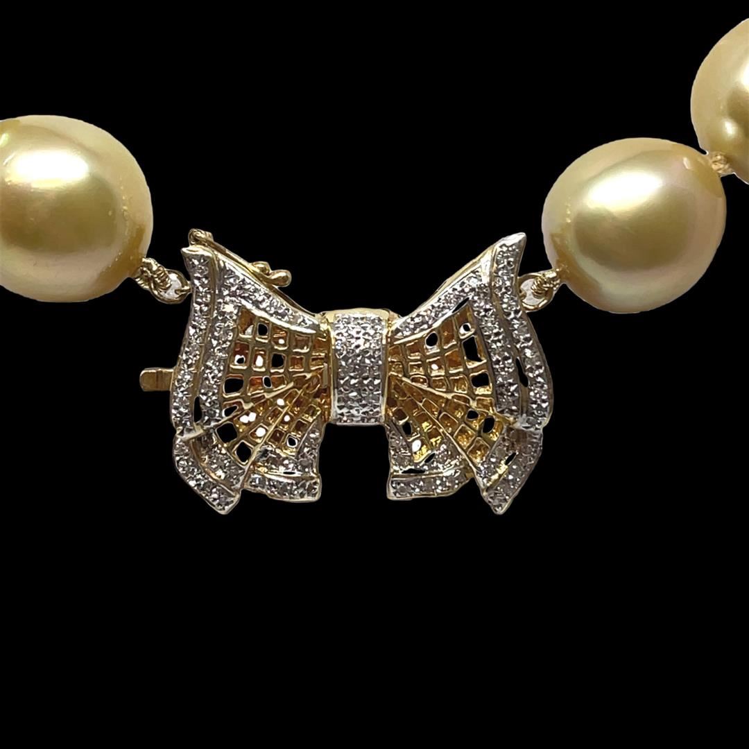 One graduated single strand pearl necklace 18.5" princess length, knotted with a tongue clasp & foldover safety containing 31 south sea cultured pearls, 14.6mm to 11.0mm in size. The pearls are golden in color, green overtone with a very good luster, near round to off round, and mostly clean with very good matching. The featured pearl necklace has a 14KT yellow gold bow motif clasp encrusted with diamonds. Graded on the strand.South Sea cultured pearls are farmed in the oceans surrounding Australia, Indonesia, the Philippines and the southern coast of China. The main source of Australian South Sea pearls lies in the northwest on the Kimberly coast. South Sea cultured pearls are formed in the Pinctada Maxima oyster, which is the world's largest pearl cultivating oyster and is native to the South China Sea, the Java, the Indian and the Pacific Oceans. There are two varieties of the Pinctada Maxima oyster: the Gold Lipped oyster which produces golden colored pearls, and the Silver Lipped oyster which produces white colored pearls. These pearls take between two to three years to grow and have a unique nacre due to the fast moving and clean waters of the South Seas. Sixty-Eight prong set single cut diamonds, measuring 1.10 - 1.00 x 0.65mm (depth est.) approximate total weight of 68 Stones = 0.30ct. Graded in the setting. Color H - I Clarity SI-1 to I-1 Cut Good Total Weight of Diamonds 0.30ct. Total Weight of 93.40gm