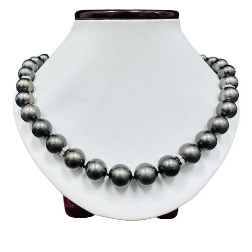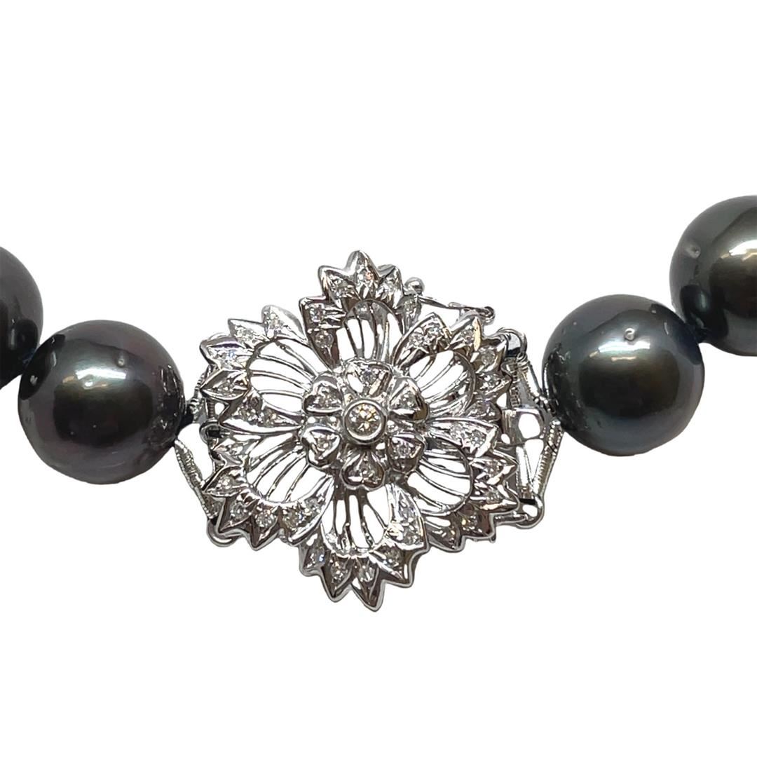 One graduated single strand pearl necklace 18.5" princess length, knotted with a tongue clasp & foldover safety containing 35 Tahitian pearls, 13.3mm to 11.2mm in size. The pearls are black in color, green overtone with a very good luster, round to near round, and lightly blemished with very good matching. The featured pearl necklace has a 14KT rounded floral motif clasp encrusted with diamonds and features 4 diamond encrusted rondels. Graded on the strand.Tahitian cultured pearls form in the Pinctada Margaritifera oysters. This species is native to the central and South Pacific Ocean but is generally raised in lagoons by pearl farmers. Tahitian cultured pearls take between two to four years to form. One prong set round brilliant cut diamond, measuring 2.20 - 2.15 x 1.35mm (depth est.) approximate weight of 0.04ct. Graded in the setting. Color H Clarity SI-1 Cut Good Sixty-Two prong set single cut diamonds, measuring 1.10 - 1.00 x 0.65mm (depth est.) approximate total weight of 62 Stones = 0.28ct. Graded in the setting. Color H - I Clarity SI-1 to I-1 Cut Good Total Weight of Diamonds 0.32ct. Total Weight of 96.50gm