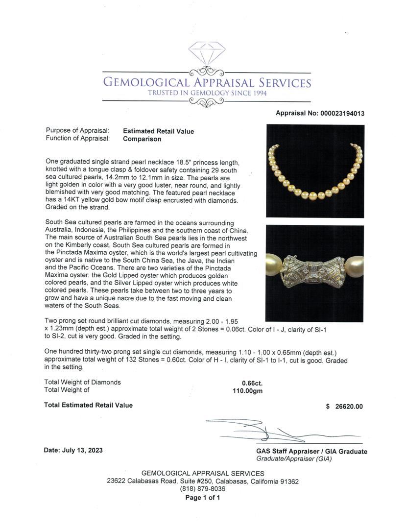 One graduated single strand pearl necklace 18.5" princess length, knotted with a tongue clasp & foldover safety containing 29 south sea cultured pearls, 14.2mm to 12.1mm in size. The pearls are light golden in color with a very good luster, near round, and lightly blemished with very good matching. The featured pearl necklace has a 14KT yellow gold bow motif clasp encrusted with diamonds. Graded on the strand. South Sea cultured pearls are farmed in the oceans surrounding Australia, Indonesia, the Philippines and the southern coast of China. The main source of Australian South Sea pearls lies in the northwest on the Kimberly coast. South Sea cultured pearls are formed in the Pinctada Maxima oyster, which is the world's largest pearl cultivating oyster and is native to the South China Sea, the Java, the Indian and the Pacific Oceans. There are two varieties of the Pinctada Maxima oyster: the Gold Lipped oyster which produces golden colored pearls, and the Silver Lipped oyster which produces white colored pearls. These pearls take between two to three years to grow and have a unique nacre due to the fast moving and clean waters of the South Seas. Two prong set round brilliant cut diamonds, measuring 2.00 -1.95 x 1.23mm (depth est.) approximate total weight of 2 Stones = 0.06ct. Color of IJ, clarity of SI-1 to SI-2, cut is very good. Graded in the setting. One hundred thirty-two prong set single cut diamonds, measuring 1.10 1,00 x 0.65mm (depth est.) approximate total weight of 132 Stones = 0.60ct. Color of H-I, clarity of SI-1 to I-1, cut is good. Graded in the setting. Total Weight of Diamonds Total Weight of Total Estimated Retail Value 0.66ct. 110.00gm $ 26620.00