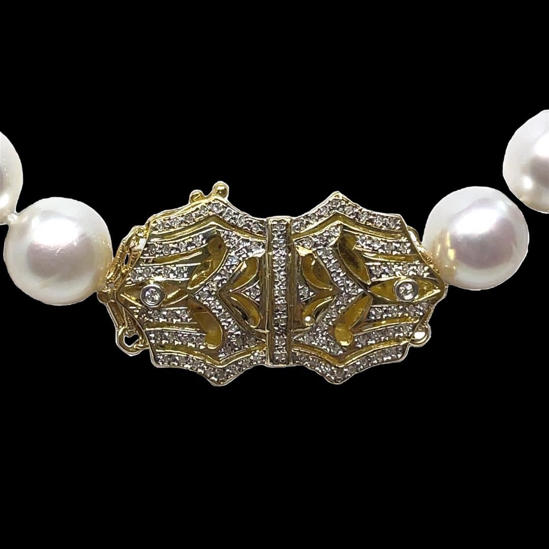 One graduated single strand pearl necklace 18.5" princess length, knotted with a tongue clasp & foldover safety containing 35 south sea cultured pearls, 14.1mm to 11.3mm in size., rosé overtone. The featured pearl necklace has a 14KT yellow gold buckle motif clasp encrusted with diamonds and four diamond set rondels. Graded on the strand.South Sea cultured pearls are farmed in the oceans surrounding Australia, Indonesia, the Philippines and the southern coast of China. The main source of Australian South Sea pearls lies in the northwest on the Kimberly coast. South Sea cultured pearls are formed in the Pinctada Maxima oyster, which is the world's largest pearl cultivating oyster and is native to the South China Sea, the Java, the Indian and the Pacific Oceans. There are two varieties of the Pinctada Maxima oyster: the Gold Lipped oyster which produces golden colored pearls, and the Silver Lipped oyster which produces white colored pearls. These pearls take between two to three years to grow and have a unique nacre due to the fast moving and clean waters of the South Seas. Two bezel set round brilliant cut diamonds, measuring 1.50 - 1.45 x 0.92mm (depth est.) approximate total weight of 2 Stones = 0.03ct. Graded in the setting. Color H Clarity SI-1 Cut Good One Hundred One prong set single cut diamonds, measuring 1.10 - 1.00 x 0.65mm (depth est.) approximate total weight of 101 Stones = 0.45ct. Graded in the setting. Color H - I Clarity SI-1 to I-1 Cut Good Twenty-Four bezel set single cut diamonds, measuring 1.10 - 1.00 x 0.65mm (depth est.) approximate total weight of 24 Stones = 0.10ct. Graded in the setting. Color H - I Clarity SI-1 to I-1 Cut Good Total Weight of Diamonds 0.58ct. Total Weight of 103.40gm