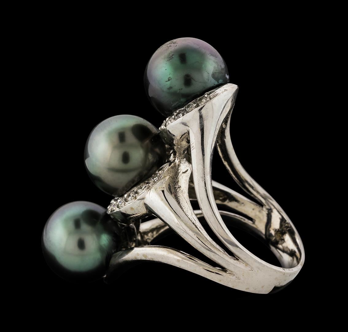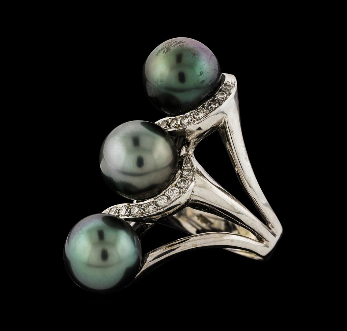 One electronically tested 14KT white gold lady's cast fashion ring with a triple split shank with a bright polish finish. The featured lady's ring has a diamond set vertical bypass motif and a shank measuring 3.84 millimeters wide. Identified with markings of 'K14'. Condition is new, good workmanship. Containing: Three Tahitian pearls, 10.4mm to 10.5mm in size. The pearls are black in color, green overtone with a good luster, round to near round, and clean with excellent matching. Graded in the setting. Twenty-Six bead set round brilliant cut diamonds, measuring 1.80 - 1.70 x 1.09mm (depth est.) approximate total weight of 26 Stones = 0.54ct. Graded in the setting. Clarity SI-1 to SI-2. Color: H - I Cut Good. Total Weight of Diamonds 0.54ct.. Total Weight of Ring 14.20gm. GAS Appraised at $6,680.00.