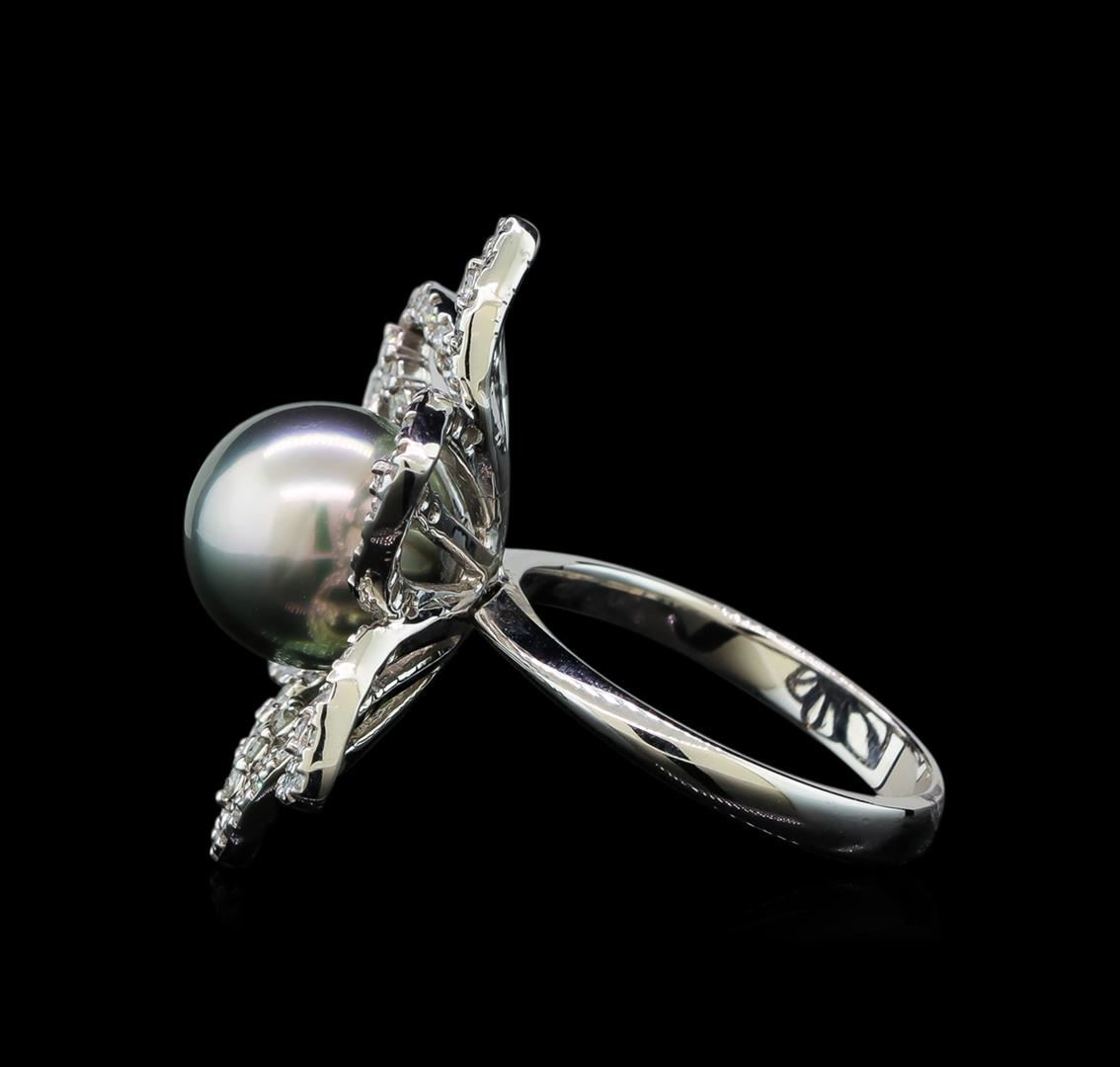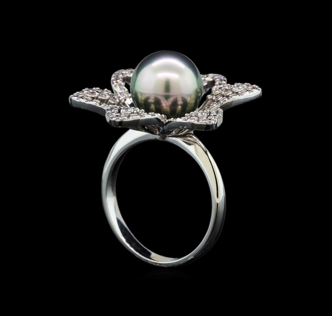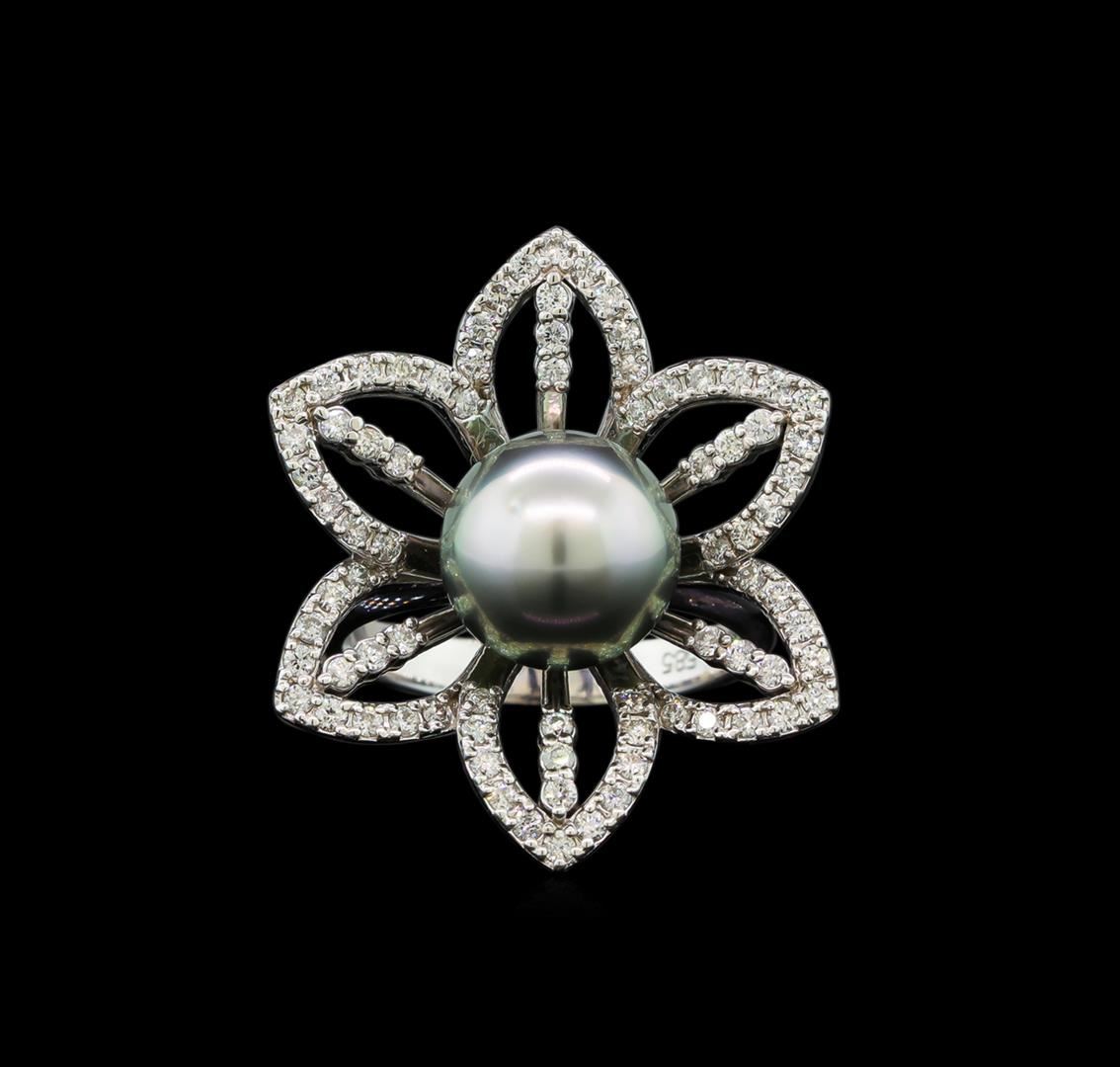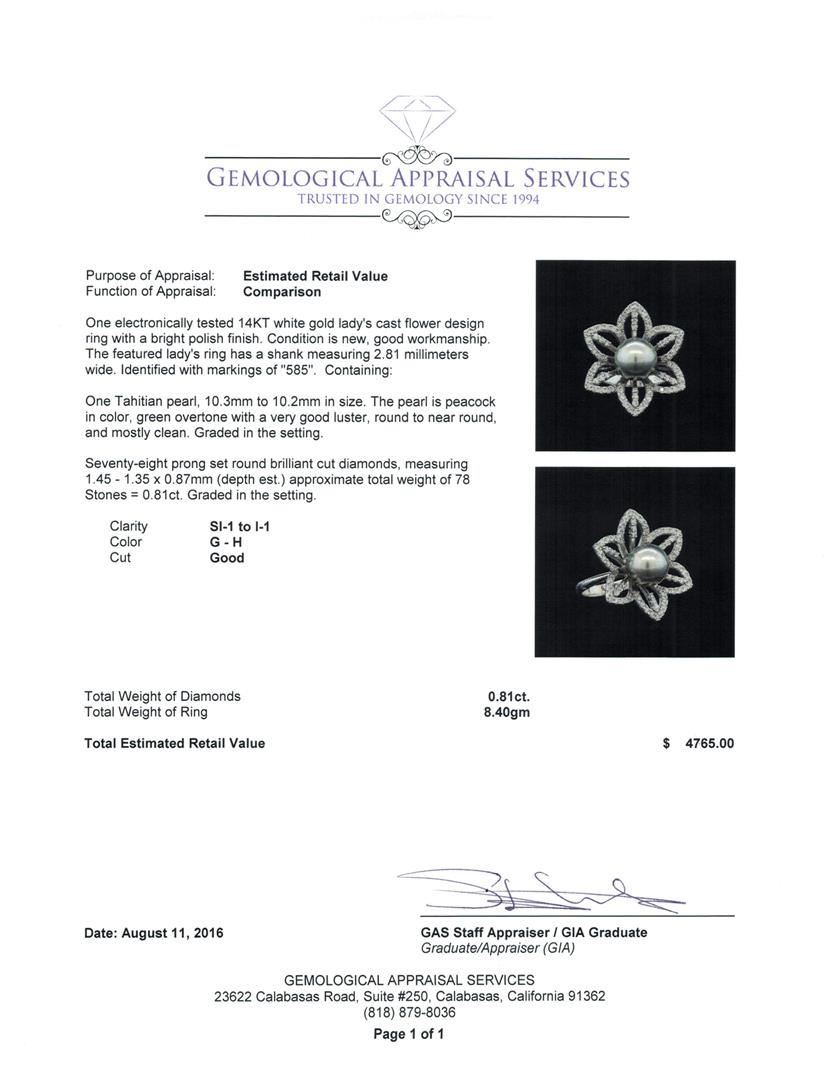 One electronically tested 14KT white gold lady's cast flower design ring with a bright polish finish. The featured lady's ring has a shank measuring 2.81 millimeters wide. Identified with markings of '585'. Condition is new, good workmanship. Containing: One Tahitian pearl, 10.3mm to 10.2mm in size. The pearl is peacock in color, green overtone with a very good luster, round to near round, and mostly clean. Graded in the setting. Seventy-Eight prong set round brilliant cut diamonds, measuring 1.45 - 1.35 x 0.87mm (depth est.) approximate total weight of 78 Stones = 0.81ct. Graded in the setting. Clarity SI-1 to I-1. Color: G - H Cut Good. Total Weight of Diamonds 0.81ct.. Total Weight of Ring 8.40gm. GAS Appraised.