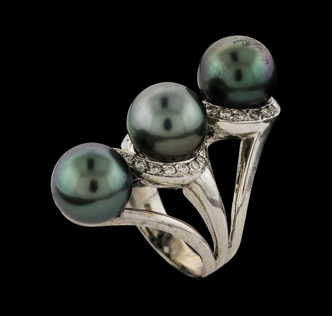 One electronically tested 14KT white gold lady's cast fashion ring with a triple split shank with a bright polish finish. The featured lady's ring has a diamond set vertical bypass motif and a shank measuring 3.84 millimeters wide. Identified with markings of 'K14'. Condition is new, good workmanship. Containing: Three Tahitian pearls, 10.4mm to 10.5mm in size. The pearls are black in color, green overtone with a good luster, round to near round, and clean with excellent matching. Graded in the setting. Twenty-Six bead set round brilliant cut diamonds, measuring 1.80 - 1.70 x 1.09mm (depth est.) approximate total weight of 26 Stones = 0.54ct. Graded in the setting. Clarity SI-1 to SI-2. Color: H - I Cut Good. Total Weight of Diamonds 0.54ct.. Total Weight of Ring 14.20gm. GAS Appraised.