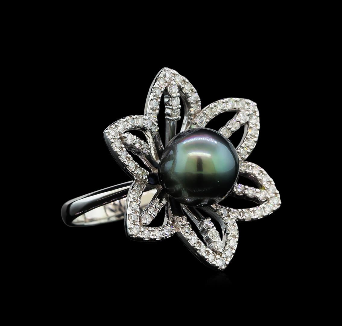 One electronically tested 14KT white gold lady's cast flower design ring with a bright polish finish. The featured lady's ring has a shank measuring 2.92 millimeters wide. Identified with markings of '585'. Condition is new, good workmanship. Containing: Seventy-Eight prong set round brilliant cut diamonds, measuring 1.45 - 1.35 x 0.87mm (depth est.) approximate total weight of 78 Stones = 0.80ct. Graded in the setting. Clarity SI-1 to I-1. Color: G - H Cut Good One Tahitian pearl, 10.4mm to 10.3mm in size. The pearl is black in color, green overtone with a very good luster, round, and clean. Graded in the setting.. Total Weight of Diamonds 0.80ct.. Total Weight of Ring 8.30gm. GAS Appraised.