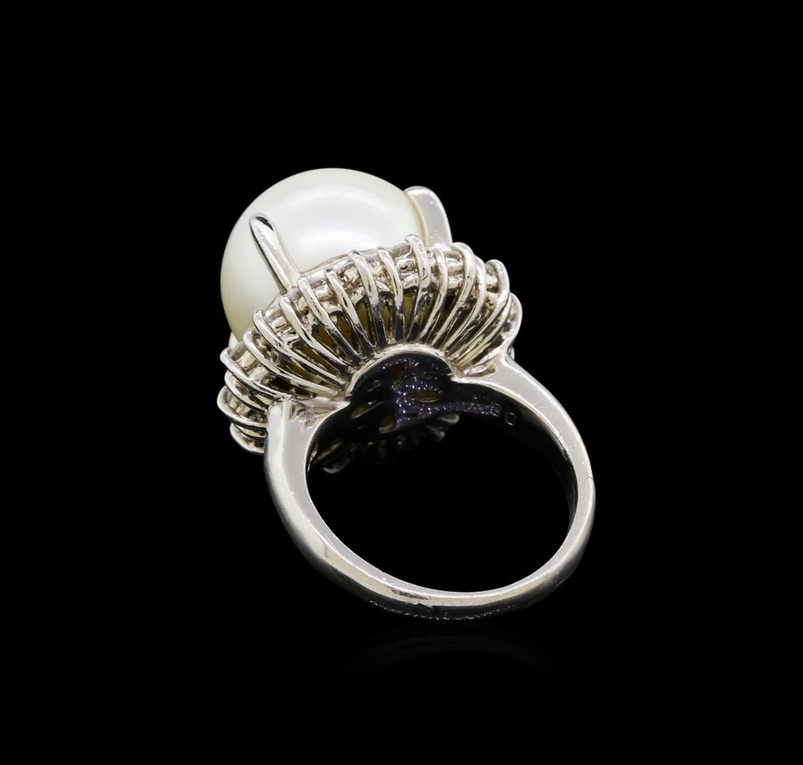 One electronically tested platinum lady's cast fashion ring with a basket halo with a bright polish finish. The featured lady's ring has a shank measuring 2.50 millimeters wide. Identified with markings of "PT 900". Condition is new, good workmanship. Containing: One south sea cultured pearl, 14.4mm in size to 14.4mm in size. The pearl is white in color with a good luster, round, and clean. Graded in the setting. Sixteen prong set round brilliant cut diamonds, measuring 2.90 - 2.80 x 1.71mm (depth est.) approximate total weight of 16 Stones = 1.36ct. Graded in the setting. Clarity: VS-1 to VS-2. Color: F - Very Good. Total Weight of Diamonds 1.36ct. Total Weight of Ring 18.60gm. GAS Appraised.