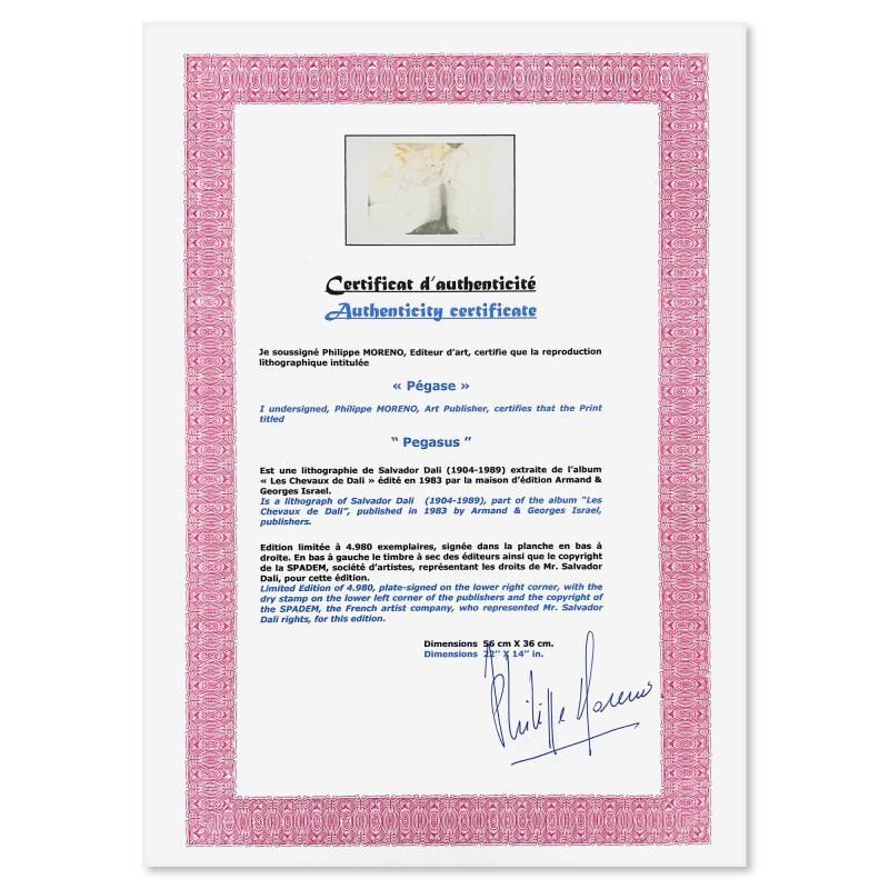 "Pegase (Pegasus)" is a limited edition lithograph by Salvador Dali (1904-1989), bearing the plate signature of the artist. This piece was published by Armand & Georges Israel in 1983 during Dali's lifetime and under his supervision. This piece was printed on Velin D'arches paper in Paris. This work is referenced in The Official Catalog of the Graphic Works of Salvador Dali (Albert Fields). This piece comes custom framed. Includes Certificate of Authenticity. Measures approx. 28" x 20" (frame), 22" x 14" (image).