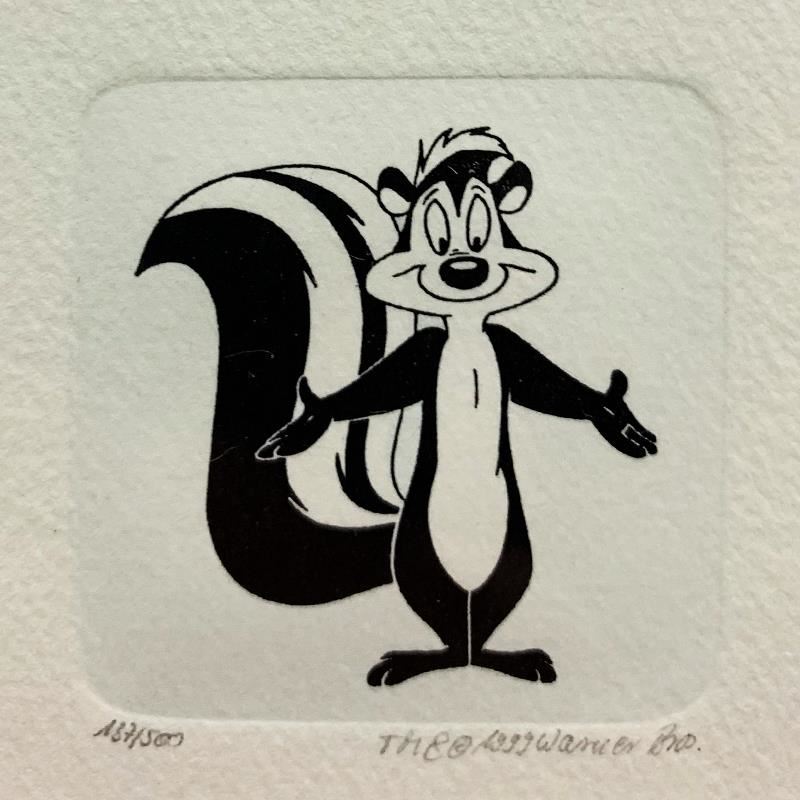 "Pepe le Pew" is a limited edition etching on paper with hand-tinted coloring from Warner Bros, numbered and dated 1999. This piece comes framed. Measures approximately 9" x 9" (frame), 2" x 2" (image).