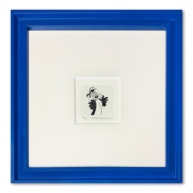 "Pepe le Pew" is a limited edition etching on paper with hand-tinted coloring from Warner Bros, numbered and dated 1999. This piece comes framed. Measures approximately 9" x 9" (frame), 2" x 2" (image).
