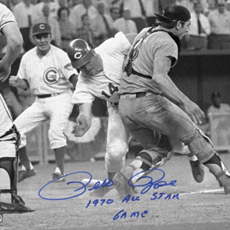 "Pete Rose - Fosse Collision" is an archival photograph featuring Pete Rose crashing into Ray Fosse to score the winning run at the All-Star Game in Cincinnati on July 14, 1970 is autographed boldly by Pete Rose. Includes Certificate of Authenticity. This piece comes framed. Measures approx. 26" x 22" (frame), 20" x 16" (image).