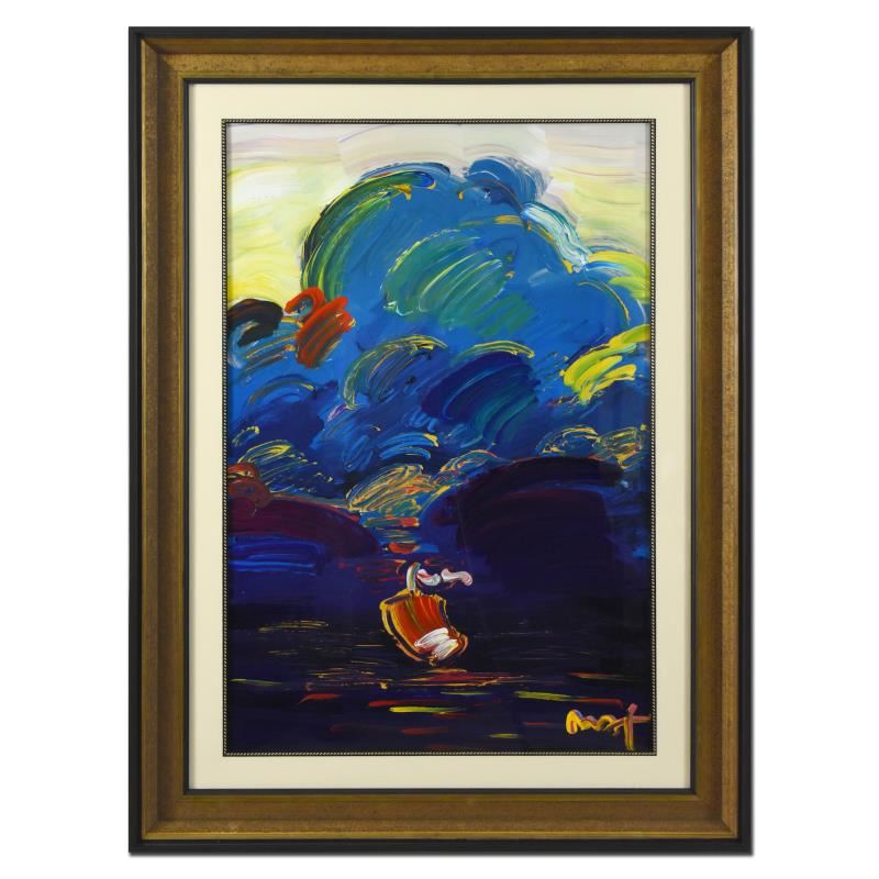 "Summer Storm" is a one-of-a-kind acrylic mixed media on paper, hand signed by Peter Max. This piece comes custom framed. Includes Certificate of Authenticity from Peter Max Studios. Measures approx. 34" x 46" (with frame), 23" x 35" (image).