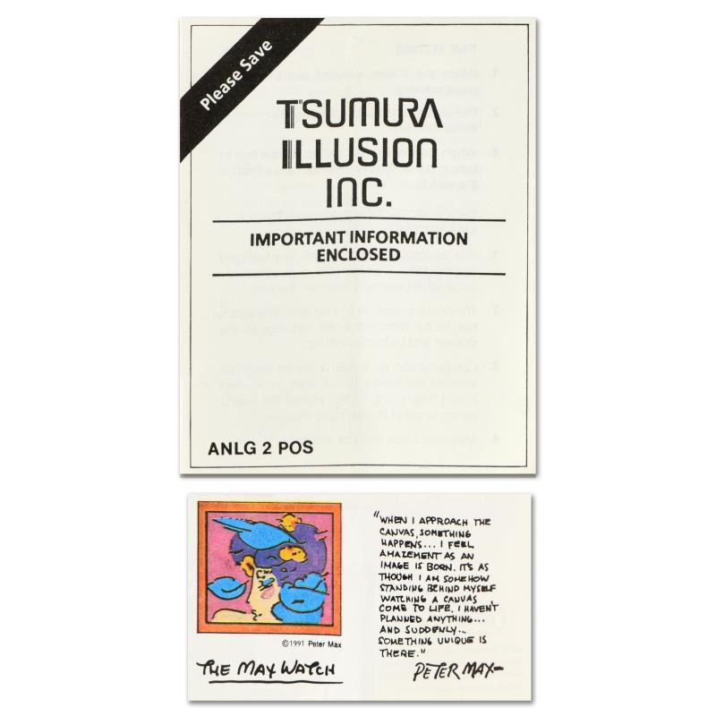 This is a vintage Peter Max wrist watch created for the Japanese market in 1991. This watch comes in the original packaging and with paperwork. Due to the age of the watch the battery will need to be replaced. A replacement battery will be included in this auction complementary. Measures approx. 1.5" x 1.5" (watch face).