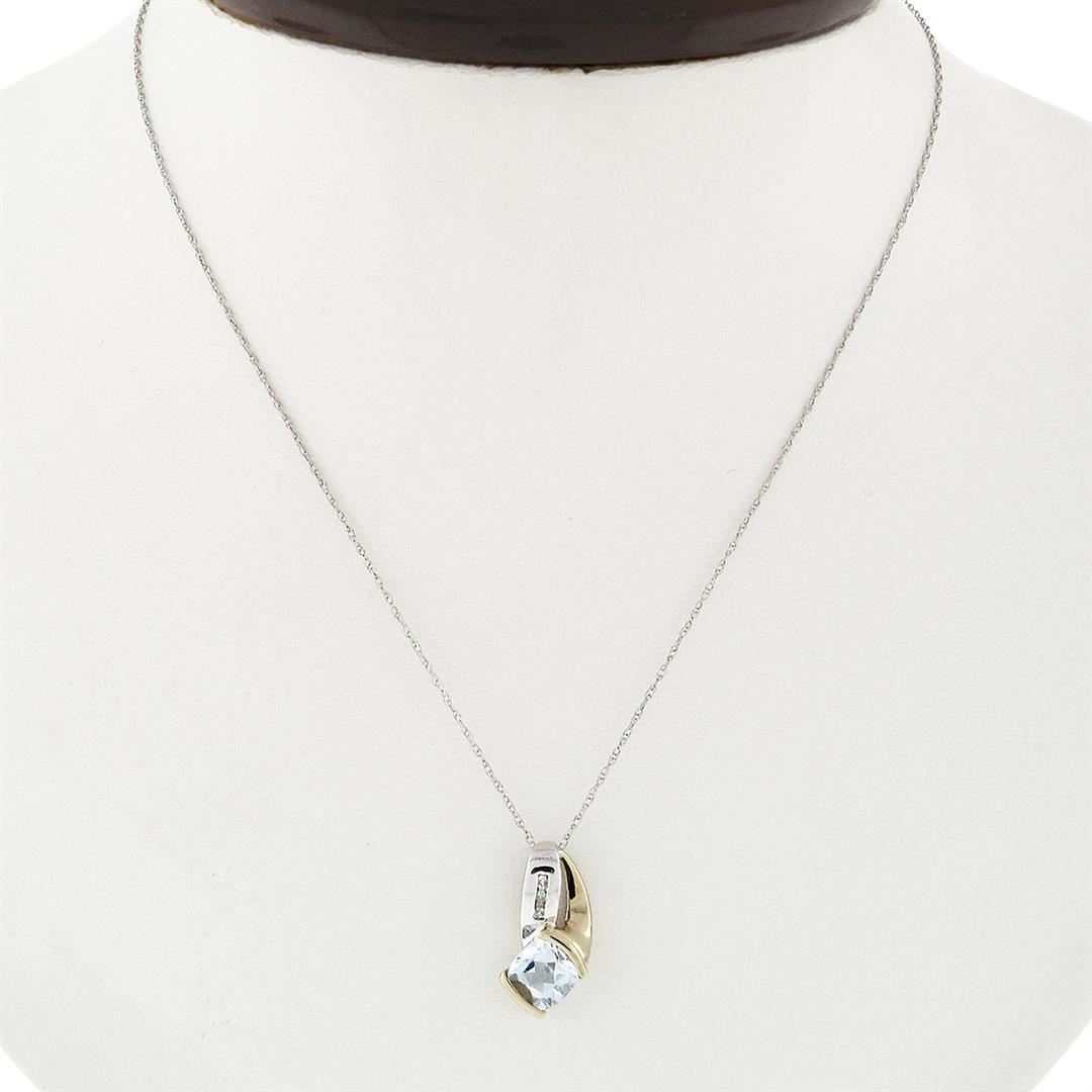An estate solid 10k yellow & white gold pendant necklace, featuring 1 cushion cut natural blue topaz (6x6mm - 0.50ctw ), & 3 round brilliant cut natural diamonds (I1/I2 ; G/H - 0.06ctw). 16 inch rope link chain, 2.09 grams total weight, pendant measures 17x8.1mm.
