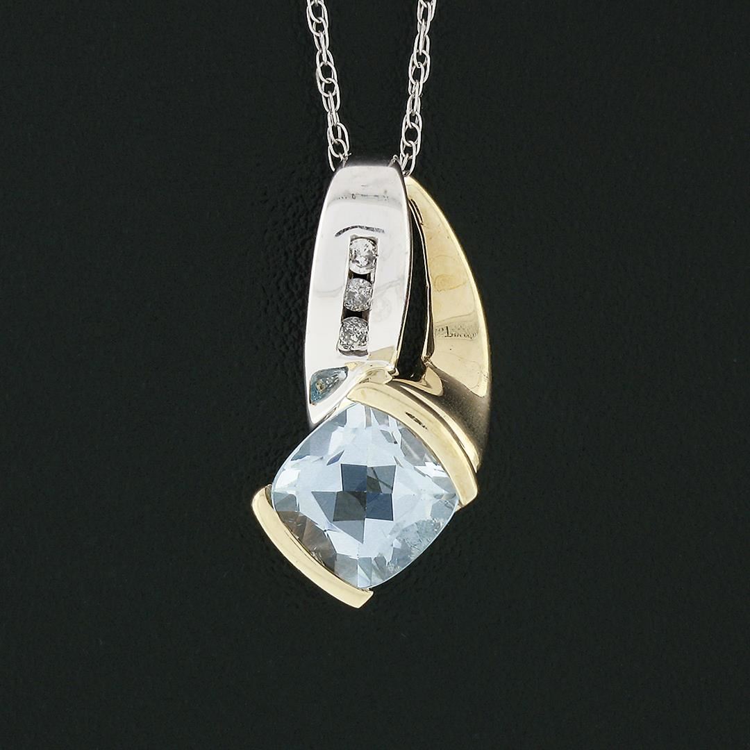 An estate solid 10k yellow & white gold pendant necklace, featuring 1 cushion cut natural blue topaz (6x6mm - 0.50ctw ), & 3 round brilliant cut natural diamonds (I1/I2 ; G/H - 0.06ctw). 16 inch rope link chain, 2.09 grams total weight, pendant measures 17x8.1mm.