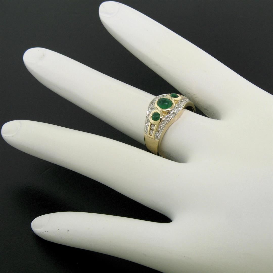 One Petite 14K TT Gold 0.68ctw 3 Cabochon Emerald & Diamond Accented Cocktail Ring. Item Details: Material: 14K Solid Yellow and White Gold, Weight: 4.41 Grams, Stone(s): (3) Natural Genuine Emeralds - Cabochon Cut - Bezel Set - Rich Green Color - 0.40ctw (approx.), (25) Natural Genuine Diamonds - Round Brilliant Cut - Pave & Channel Set - VS2/SI1 Clarity - G/H Color - 0.28ctw (approx.), Total Carat Weight: 0.68 (approx.), Ring Size: 6.5 , Ring Width: 9.88mm, Ring Height: 4.88mm rise off the finger Condition: Like New!