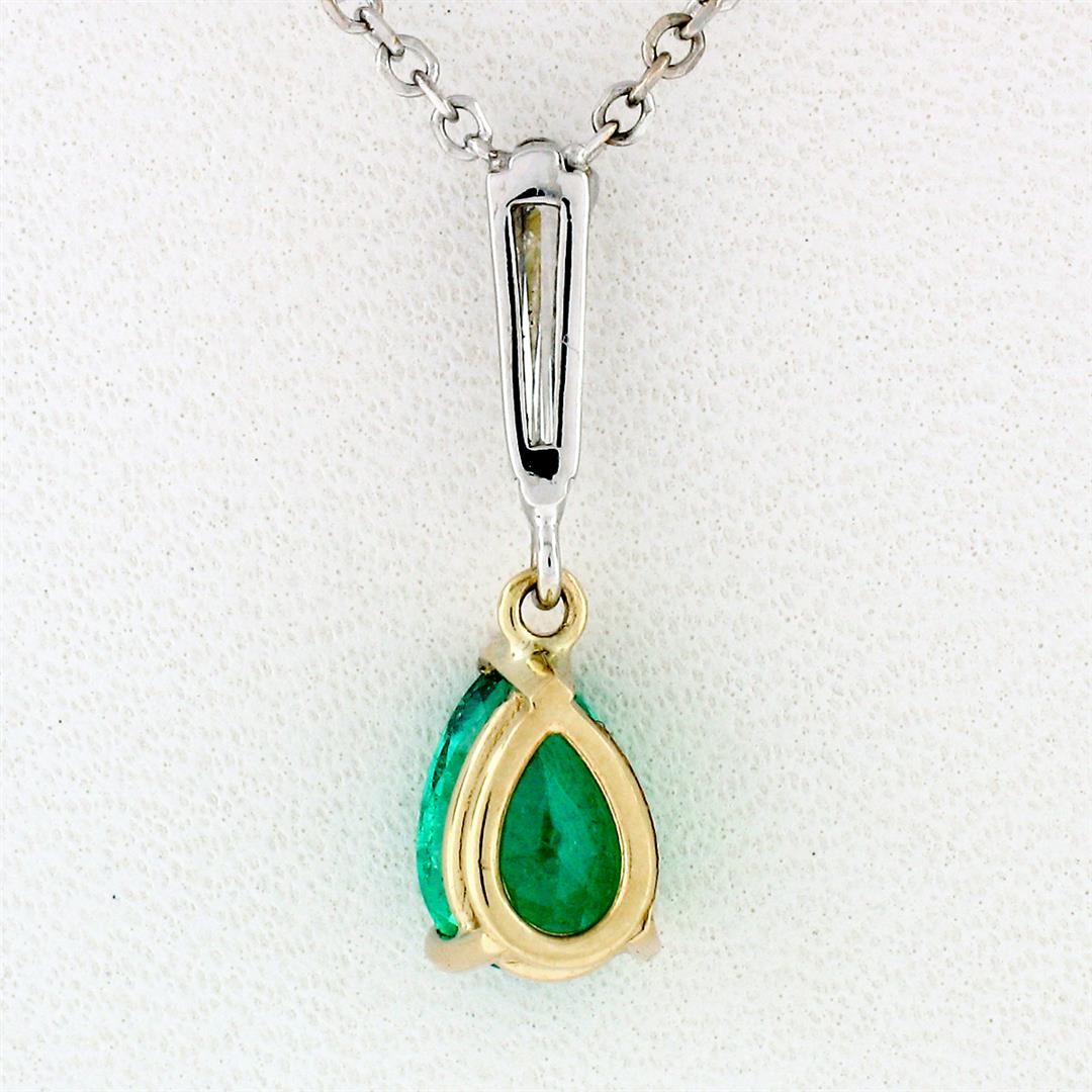 a new solid 14k yellow & white gold petite pendant, with 1 pear cut natural emerald (0.61ct - 7.0x4.90mm), and 1 long tapered baguette cut natural diamond (G- VVS2; 0.20ct). The pendant weighs a total of 2.30 grams, measures 17.15x4.90mm including the bail, and an adjustable 16 or 18 inch cable link chain.