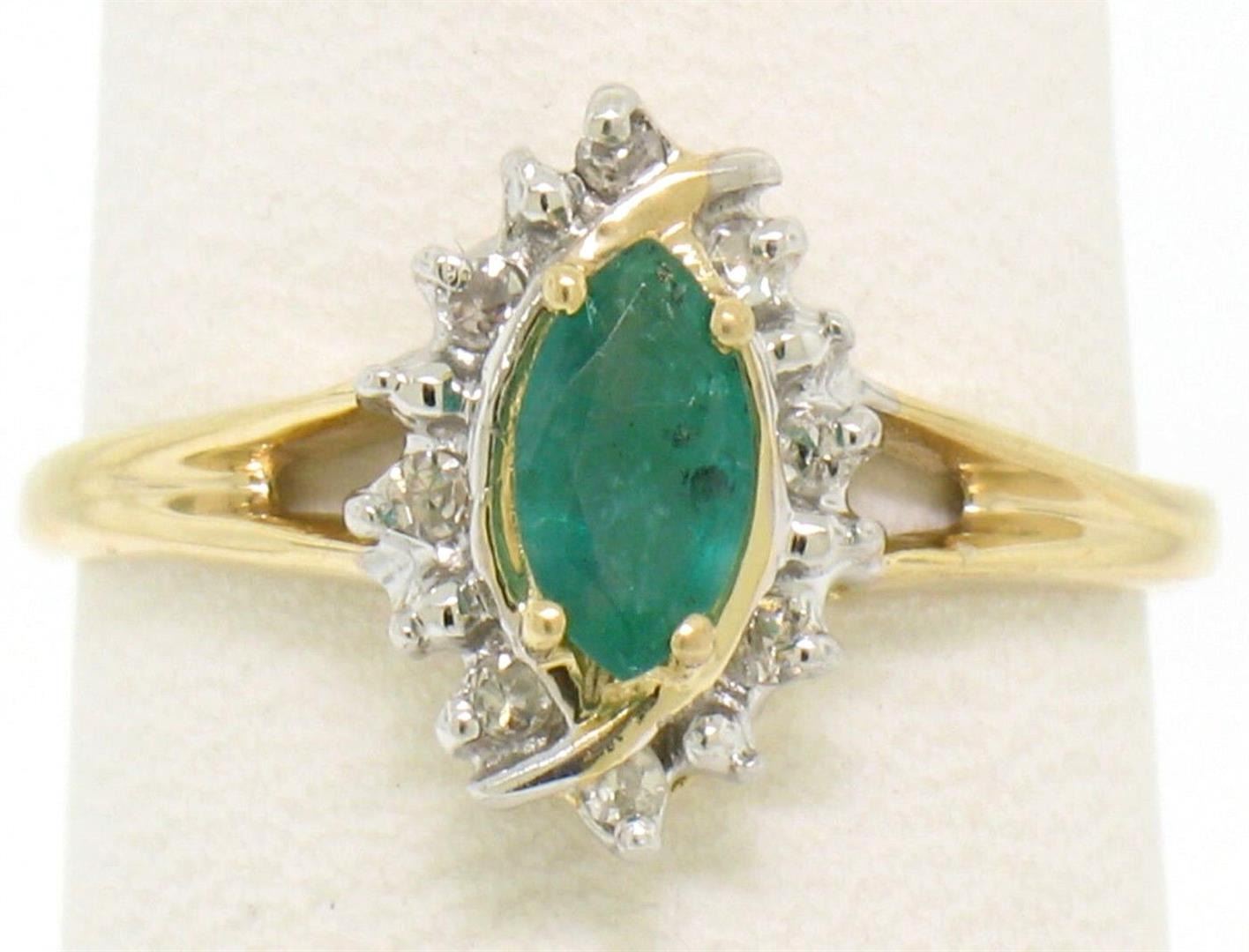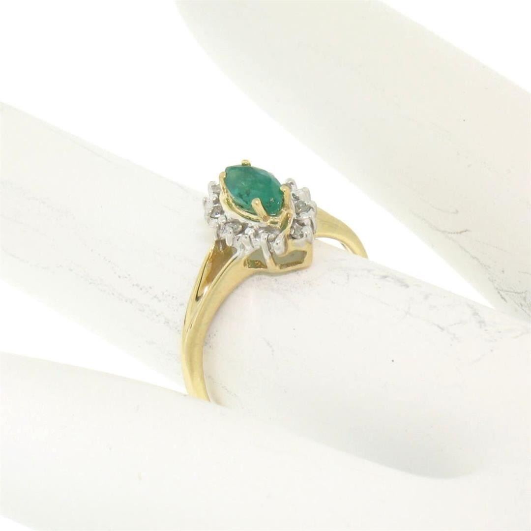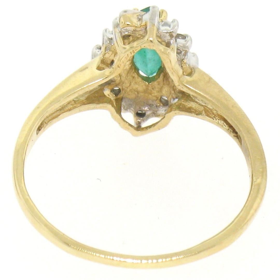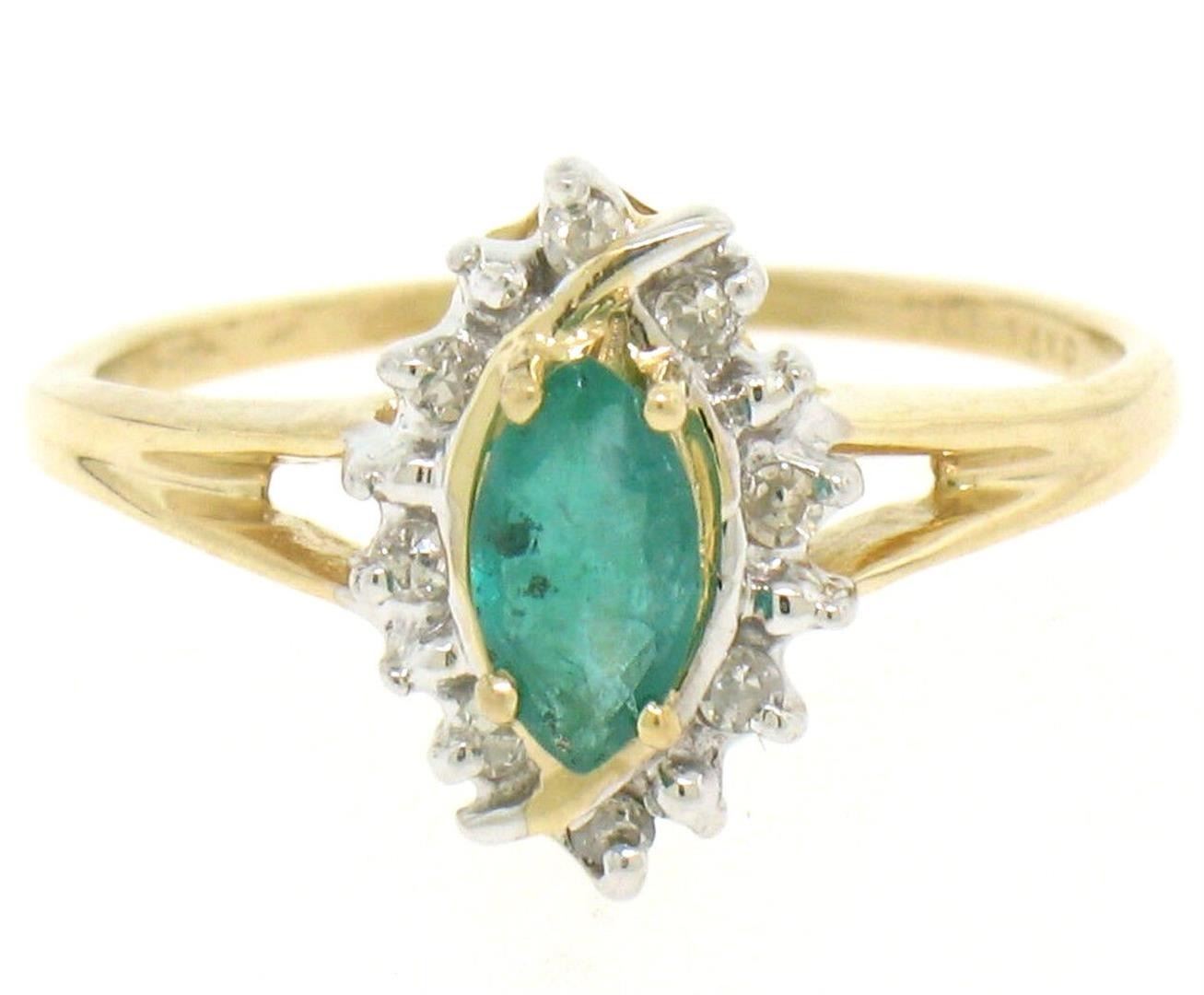 Petite 14k Yellow Gold .47ctw Marquise Emerald Solitaire Round Diamond Halo Ring. Please see photos and description for all available information. An estate solid 14k yellow gold solitaire ring, featuring 1 marquise cut natural emerald (0.35ct), with a halo of 8 round single cut natural diamonds (H- SI1; 0.12ctw). The ring is size 4.25, weighs a total of 1.6 grams, and measures 7.57mm wide.