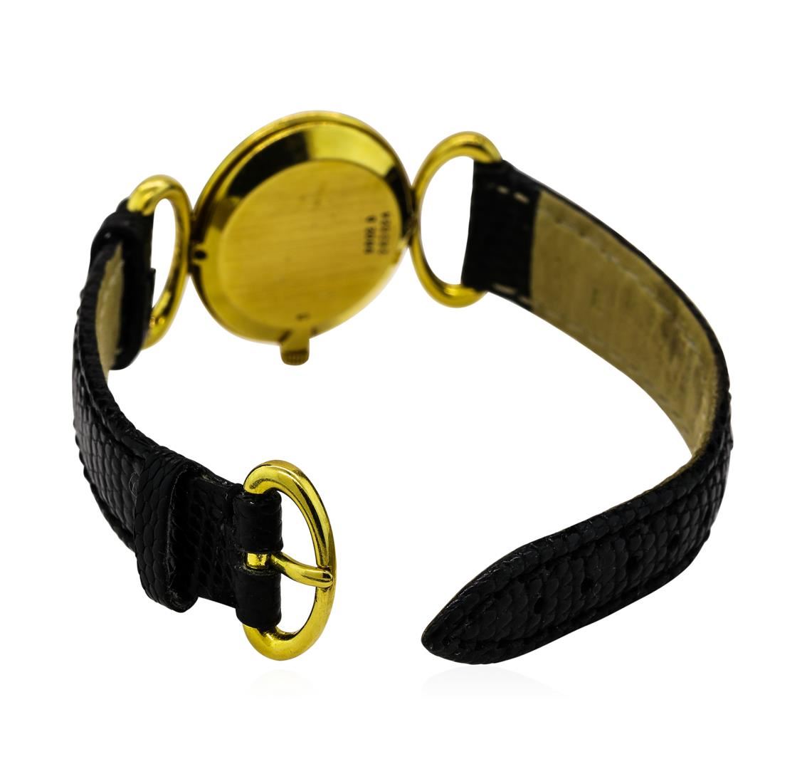 One ladies, Piaget wristwatch, electronically tested 18KT yellow gold, Swiss Hallmarked Case: 27 23mm, Case Back: engraved with manufacturer's ID numbers, there is room available for a personalized engraving, Crown: scalloped, Bezel: polished, Crystal: synthetic sapphire lens. Movement: mechanical stem wind, Piaget signed Dial: diamond set, with pointed hands, Italian Bracelet: Black Lizard strap, seven and one half inch length. 18KT Yellow gold Piaget buckle. Condition: G-5 Fine. Containing: Eighty-Two prong set single cut diamonds, measuring 1.10 - 1.10 x 0.66mm (depth est.) approximate total weight of 82 Stones = 0.50ct. The clarity grade reflects the overall average for the group. Graded in the setting. Clarity: VS-1 to SI-1 Color G - H. Total Weight of Diamonds 0.50ct. Total Weight of Wristwatch 25.94gm. AIG Appraised.