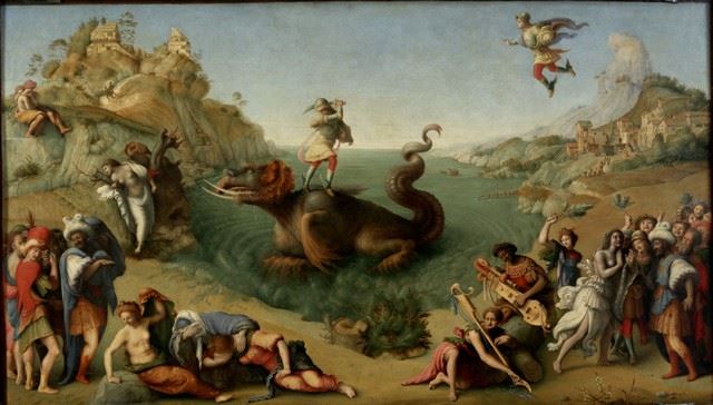 Artist: Piero di Cosimo - Title: Andromeda freed by Perseus - Medium: Fine Art Reproduction Giclee on Canvas - Image Size: Approximately 18.25 inches x 32 inches - Unframed on Unstretched Canvas - Biography: Piero di Cosimo (2 January 1462 - 12 April 1522), also known as Piero di Lorenzo, was an Italian painter of the Renaissance. He is most famous for the mythological and allegorical subjects he painted in the late Quattrocento; he is said to have abandoned these to return to religious subjects under the influence of Savonarola, the preacher who exercised a huge sway in Florence in the 1490s, and had a similar effect on Botticelli. The High Renaissance style of the new century had little influence on him, and he retained the straightforward realism of his figures, which combines with an often whimsical treatment of his subjects to create the distinctive mood of his works.