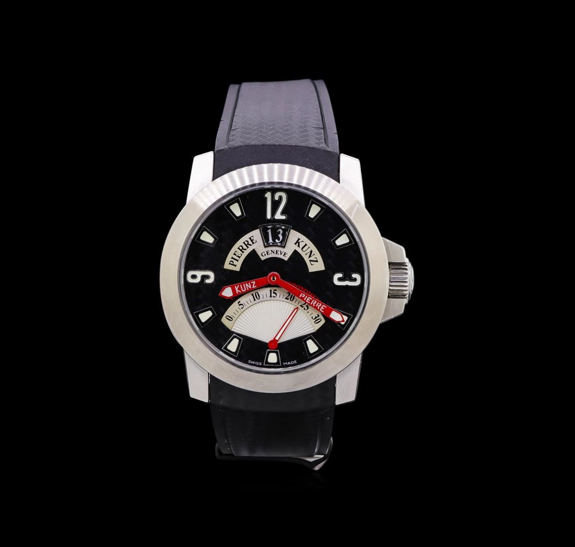 One Pierre Kunz PK G016 Sport men's watch featuring: Case: Stainless steel. Bezel: Stainless steel. Crystal: Sapphire. Dial: Black texalium. Functions: Hours, minutes, seconds, date, and 30 seconds retrograde second guilloche dial. Bracelet: Blue rubber with carbon fiber finish.