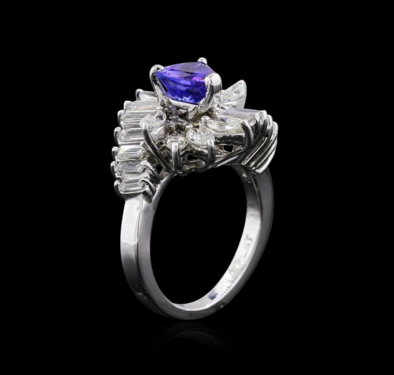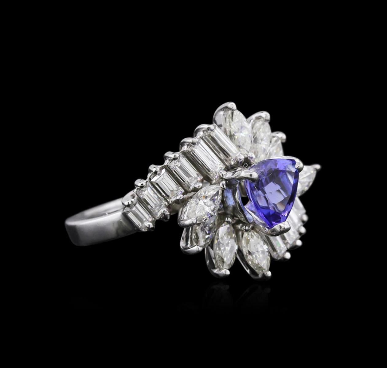One electronically tested platinum ladies cast tanzanite and diamond ring with a bright polish finish. Identified with markings of "PLAT". Condition is new. Containing: One prong set triangle modified brilliant cut natural tanzanite, measuring 6.98 x 5.65 x 4.50mm, approximate weight of 1.07ct., clarity is eye clean, type I, medium light, very slightly grayish, violet color, (GIA V 4/3), cut is good. Eight prong set marquise shaped cut diamonds, measuring 4.50 x 2.50 x 1.58mm (depth est.) approximate total weight of 8 Stones = 0.83ct. Clarity: SI-1. Color: I - J, Cut is Good. Twelve channel set baguette cut diamonds, measuring from 1.70 x 1.50 x 1.28mm (depth est.) to 4.00 x 1.50 x 1.28mm (depth est.) approximate total weight of 12 Stones = 0.60ct. Clarity: VS-2. Color: G - H, Cut is Good. All diamonds and colored gemstones are graded in the mounting, unless otherwise stated. Colored gemstones are presumed to have been subjected to commonly used enhancement processes. Total Weight of Colored Stones 1.07ct. Total Weight of Diamonds 1.43ct. Total Weight of Ring 9.60 grams. GGL Appraised.