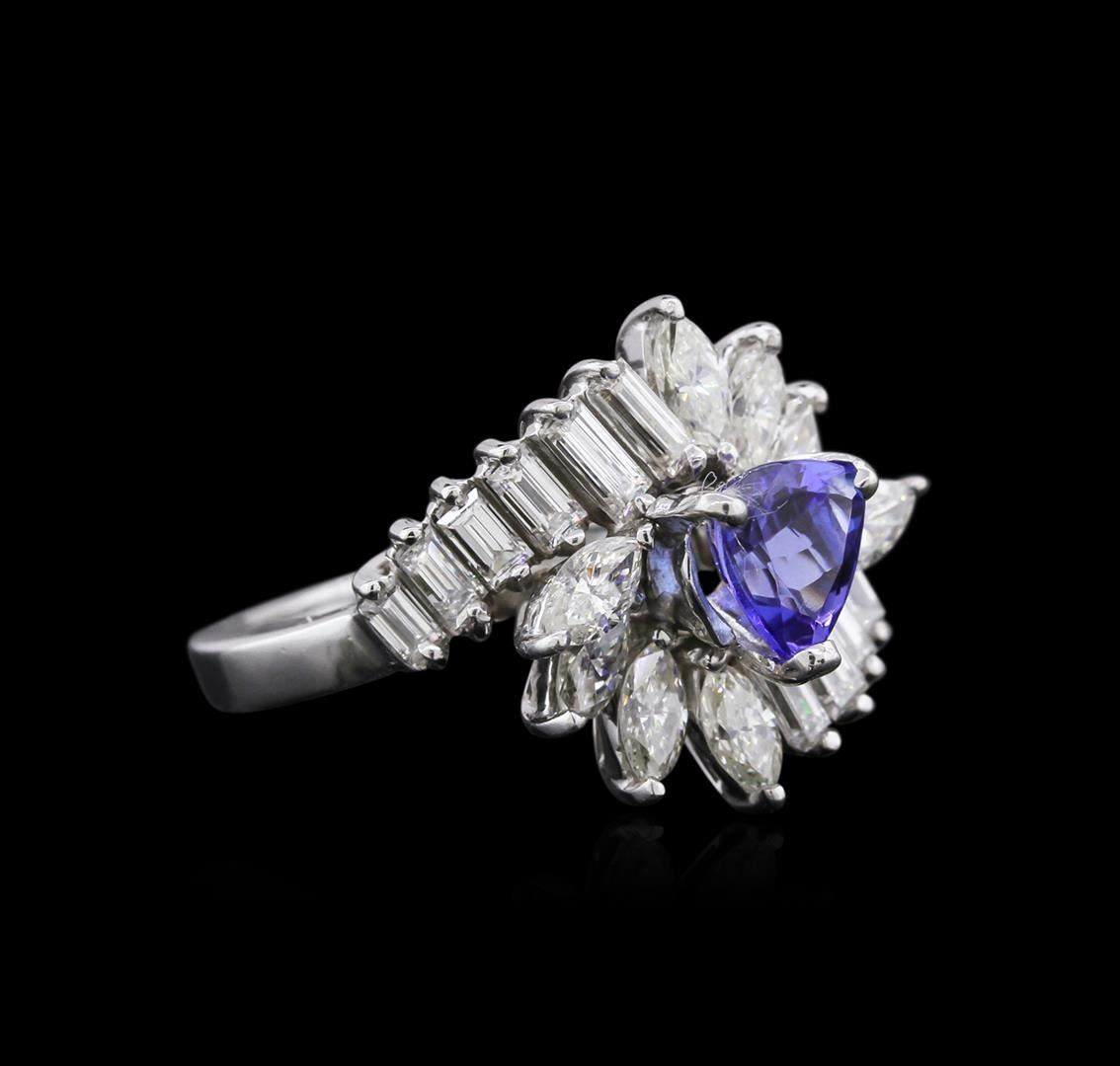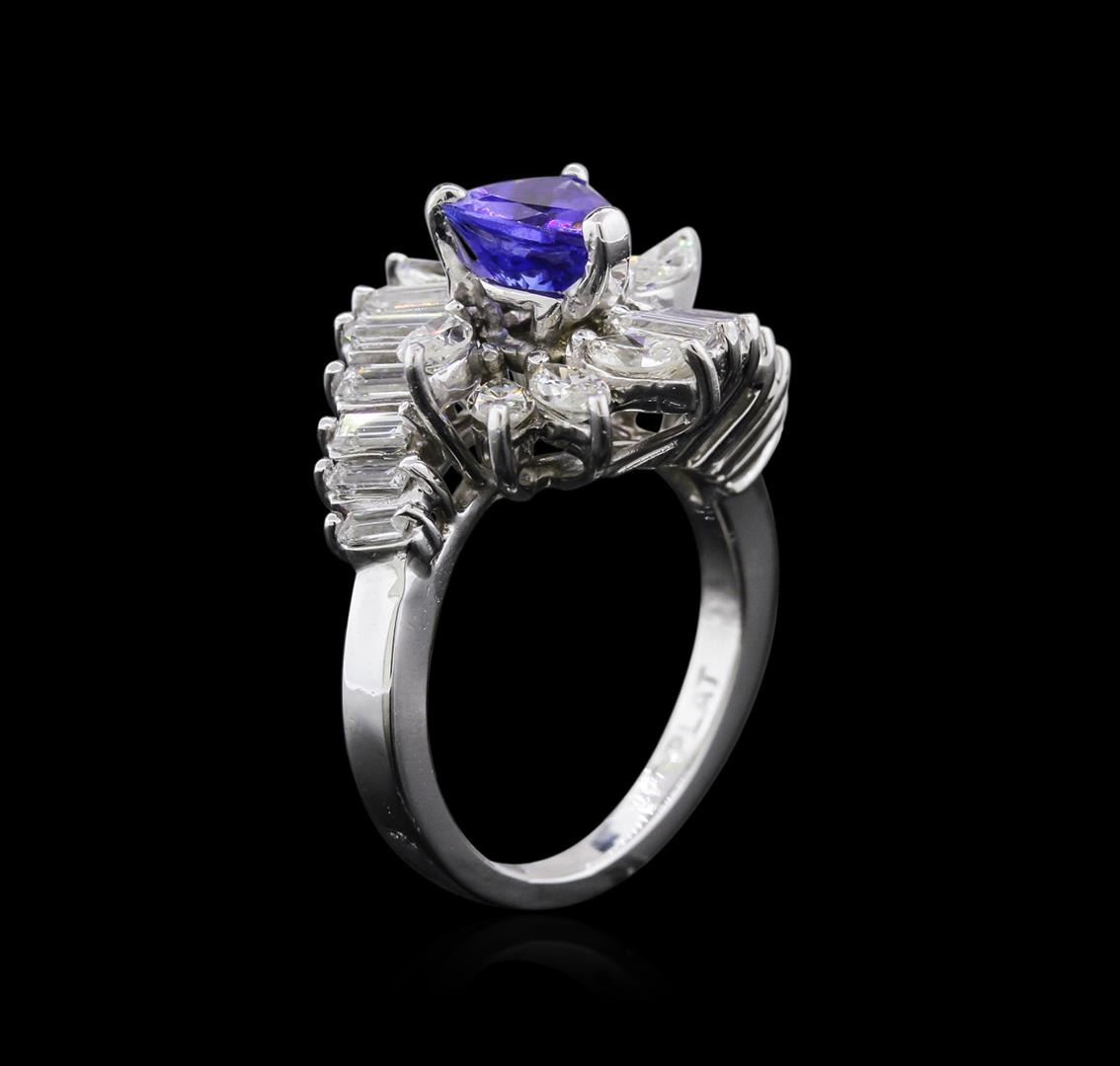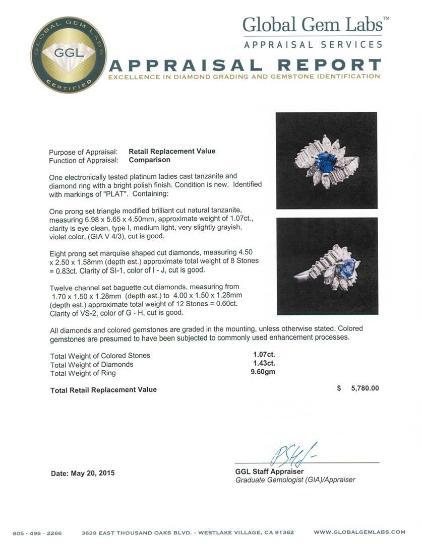 One electronically tested platinum ladies cast tanzanite and diamond ring with a bright polish finish. Identified with markings of "PLAT". Condition is new. Containing: One prong set triangle modified brilliant cut natural tanzanite, measuring 6.98 x 5.65 x 4.50mm, approximate weight of 1.07ct., clarity is eye clean, type I, medium light, very slightly grayish, violet color, (GIA V 4/3), cut is good. Eight prong set marquise shaped cut diamonds, measuring 4.50 x 2.50 x 1.58mm (depth est.) approximate total weight of 8 Stones = 0.83ct. Clarity: SI-1. Color: I - J, Cut is Good. Twelve channel set baguette cut diamonds, measuring from 1.70 x 1.50 x 1.28mm (depth est.) to 4.00 x 1.50 x 1.28mm (depth est.) approximate total weight of 12 Stones = 0.60 ct. Clarity: VS-2. Color: G - H, Cut is Good. All diamonds and colored gemstones are graded in the mounting, unless otherwise stated. Colored gemstones are presumed to have been subjected to commonly used enhancement processes. Total Weight of Colored Stones 1.07ct. Total Weight of Diamonds 1.43ct. Total Weight of Ring 9.60 grams. GGL Appraised.