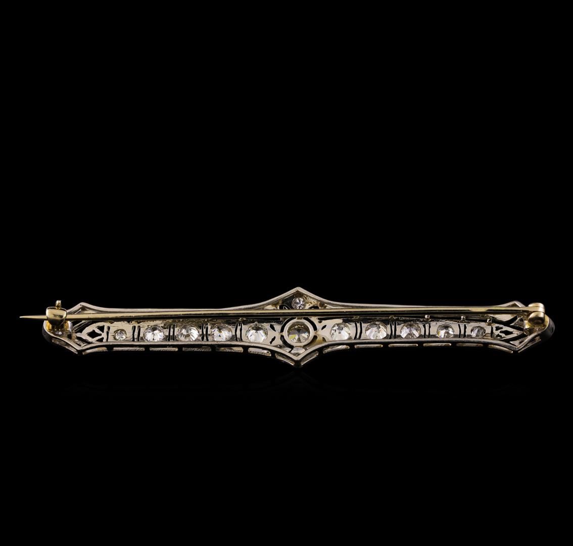 One electronically tested platinum ladies cast & assembled diamond brooch. The brooch is completed by a 14KT white gold horizontally placed pin. Bright polish finish with milgrain detailing throughout. Area measurements 2.87 x 0.50 inches. The brooch is reminiscent of the jewelry designs from the Art Deco Period. The Paris Exposition of Decorative Arts and Modern Manufacturers in 1925 gave the movement its name. The Art Deco Period is characterized with jewelry designs composed of bold geometric designs, & cubism. Condition is good. Containing: One bezel set Old European cut diamond, measuring 4.30 - 4.20 x 2.30mm (depth est.) approximate weight of 0.30ct. Cutting style circa late 19th century. Graded in the setting. Clarity: VS-2. Color: J Eight bead set Old European cut diamonds, measuring 3.50 - 3.10 x 2.00mm (depth est.) approximate total weight of 8 Stones = 1.10ct. Cutting style circa late 19th century. Graded in the setting. Clarity: SI-1 to I-1. Color: H - J Six bead set Old European cut diamonds, measuring 2.30 - 2.10 x 1.36mm (depth est.) approximate total weight of 6 Stones = 0.30ct. Cutting style circa late 19th century. Graded in the setting. Clarity: SI-2 to I-1. Color: H - I. Total Weight of Diamonds 1.70ct. Total Weight of Brooch 7.29 grams. AIG Appraised.