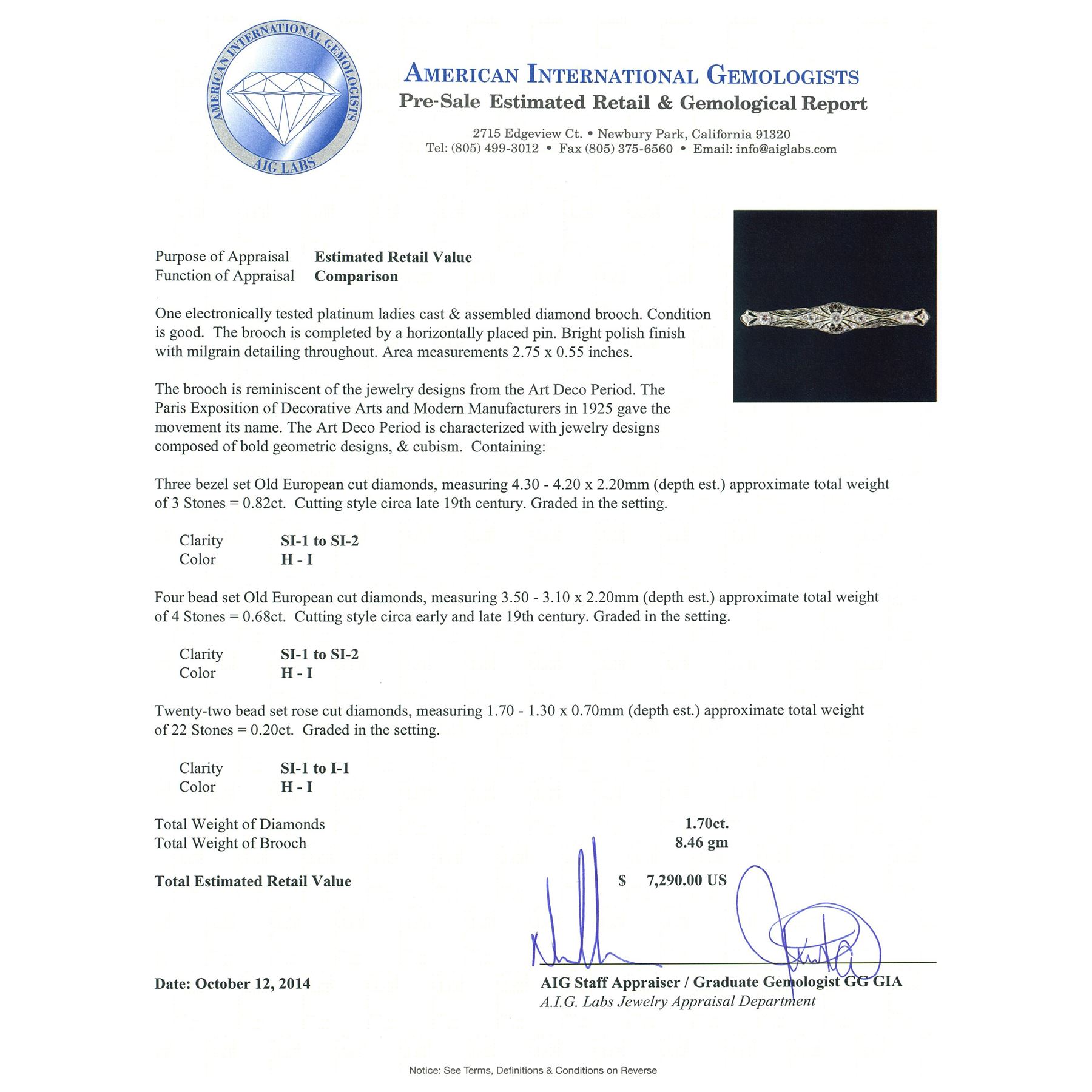 One electronically tested platinum ladies cast & assembled diamond brooch. The brooch is completed by a horizontally placed pin. Bright polish finish with milgrain detailing throughout. Area measurements 2.75 x 0.55 inches. The brooch is reminiscent of the jewelry designs from the Art Deco Period. The Paris Exposition of Decorative Arts and Modern Manufacturers in 1925 gave the movement its name. The Art Deco Period is characterized with jewelry designs composed of bold geometric designs, & cubism. Condition is good. Containing: Three bezel set Old European cut diamonds, measuring 4.30 - 4.20 x 2.20mm (depth est.) approximate total weight of 3 Stones = 0.82ct. Cutting style circa late 19th century. Graded in the setting. Clarity: SI-1 to SI-2. Color: H - I Four bead set Old European cut diamonds, measuring 3.50 - 3.10 x 2.20mm (depth est.) approximate total weight of 4 Stones = 0.68ct. Cutting style circa early and late 19th century. Graded in the setting. Clarity: SI-1 to SI-2. Color: H - I Twenty-Two bead set rose cut diamonds, measuring 1.70 - 1.30 x 0.70mm (depth est.) approximate total weight of 22 Stones = 0.20ct. Graded in the setting. Clarity: SI-1 to I-1. Color: H - I. Total Weight of Diamonds 1.70ct. Total Weight of Brooch 8.46 grams. AIG Appraised.