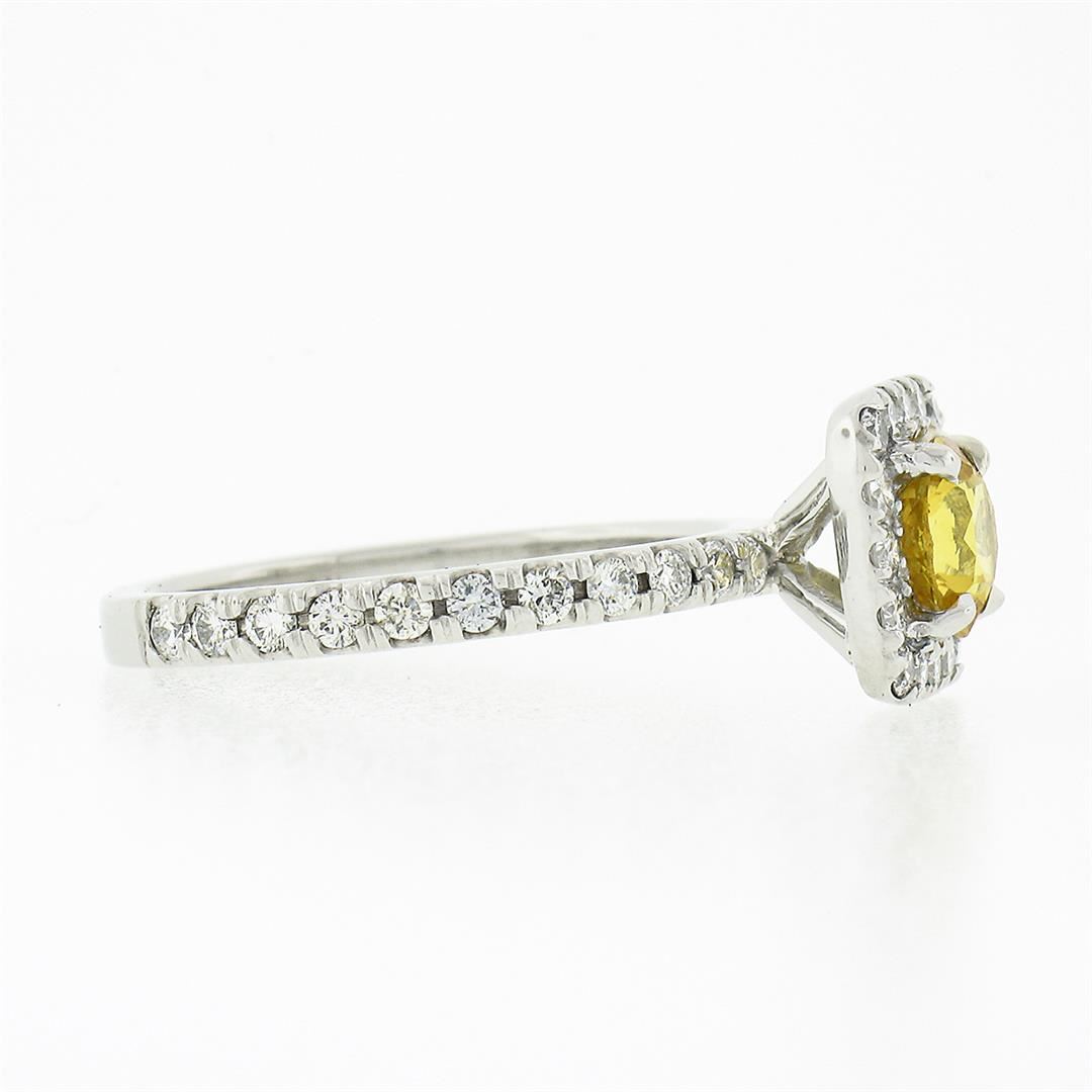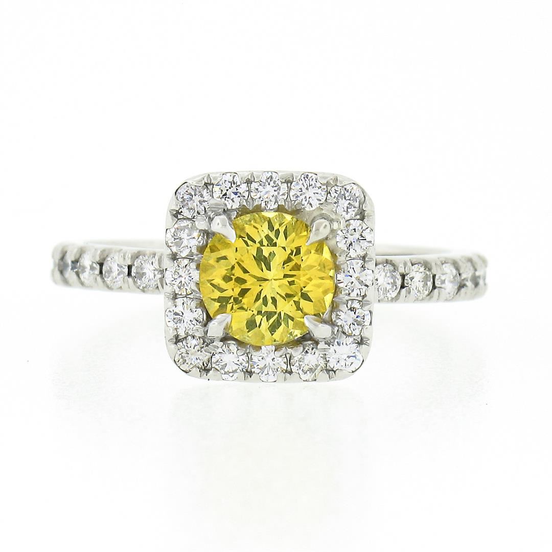 A solid platinum engagemet ring, with 1 Gia certified round brilliant cut natural yellow sapphire (0.99ct ), accented with 38 round brilliant cut natural diamonds ( F/G - VS1/VS2 ; 0.75ctw). The ring is size 7.0, weighs a total of 5.59 grams, and measure