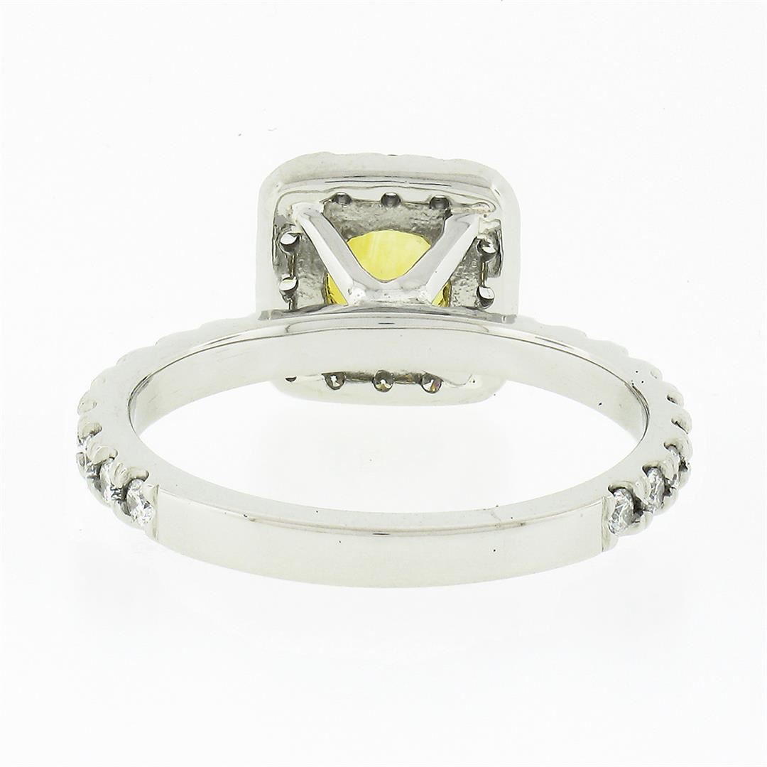 A solid platinum engagemet ring, with 1 Gia certified round brilliant cut natural yellow sapphire (0.99ct ), accented with 38 round brilliant cut natural diamonds ( F/G - VS1/VS2 ; 0.75ctw). The ring is size 7.0, weighs a total of 5.59 grams, and measure