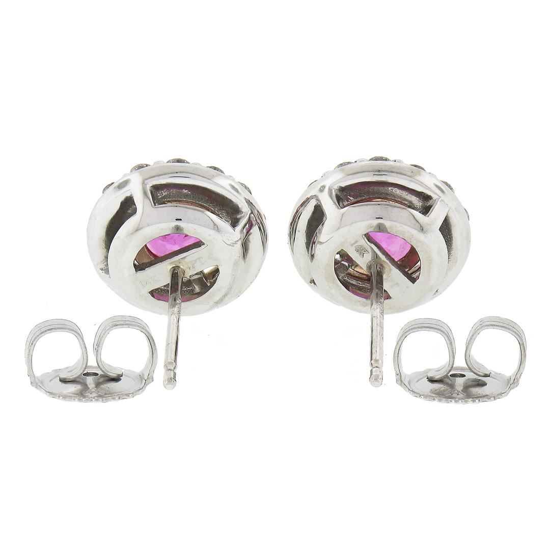 A new solid platinum & 14k rose gold stud earrings, with 2 GIA graded round cut pink sapphire (2.47ctw ), surrounded with a halo of round cut natural diamonds (G/H - VS1/VS2 ; 0.59ctw). The earrings measure approximately 10.5mm in diameter and weigh a total of 6.44 grams. Comes with all original relevant certifications.