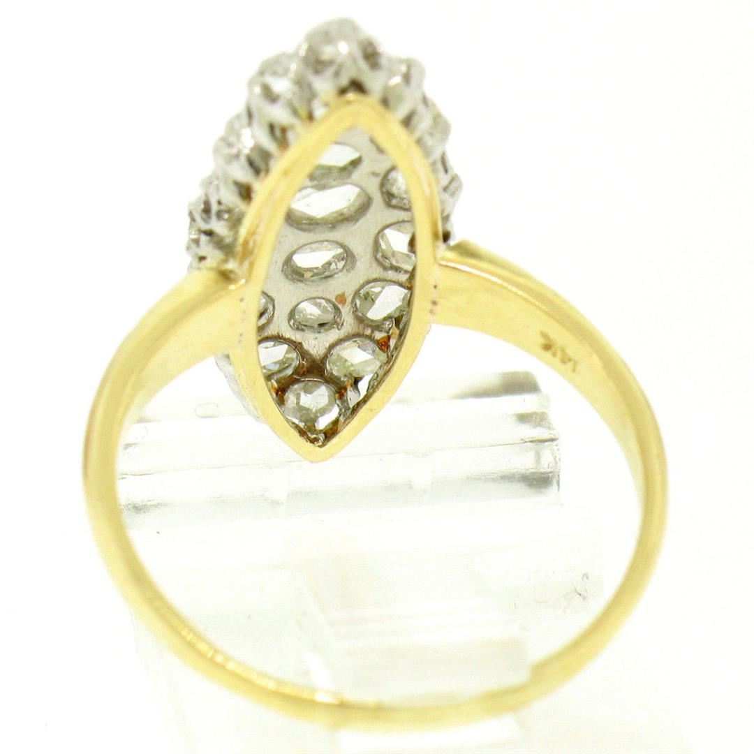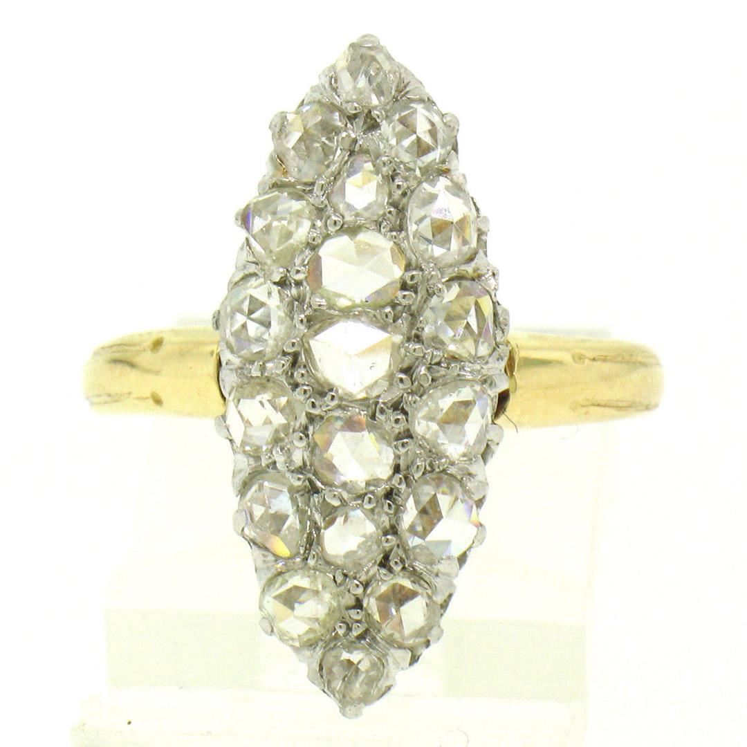 One Antique Edwardian Platinum & 14k Yellow Gold Pave Old Rose Cut Diamond Marquise Shape Ring. Item Details: Material: Solid 14k Yellow Gold w/ Solid .900 Platinum Top (Both Tested), Weight: 4.0 Grams, Stone(s): (19) Natural Genuine Diamonds - Rose Cut - Pavé Set - VS1 to SI1 Clarity - G/H Color, Total Carat Weight: 1.30 (approx.), Ring Size: 7.0 (We can custom size this ring.), Top of Ring Dimensions: 21.6x9.5mm, Condition: Antique Edwardian era ring in excellent, ready to wear condition. The ring is all original except for the finish. It has been polished.