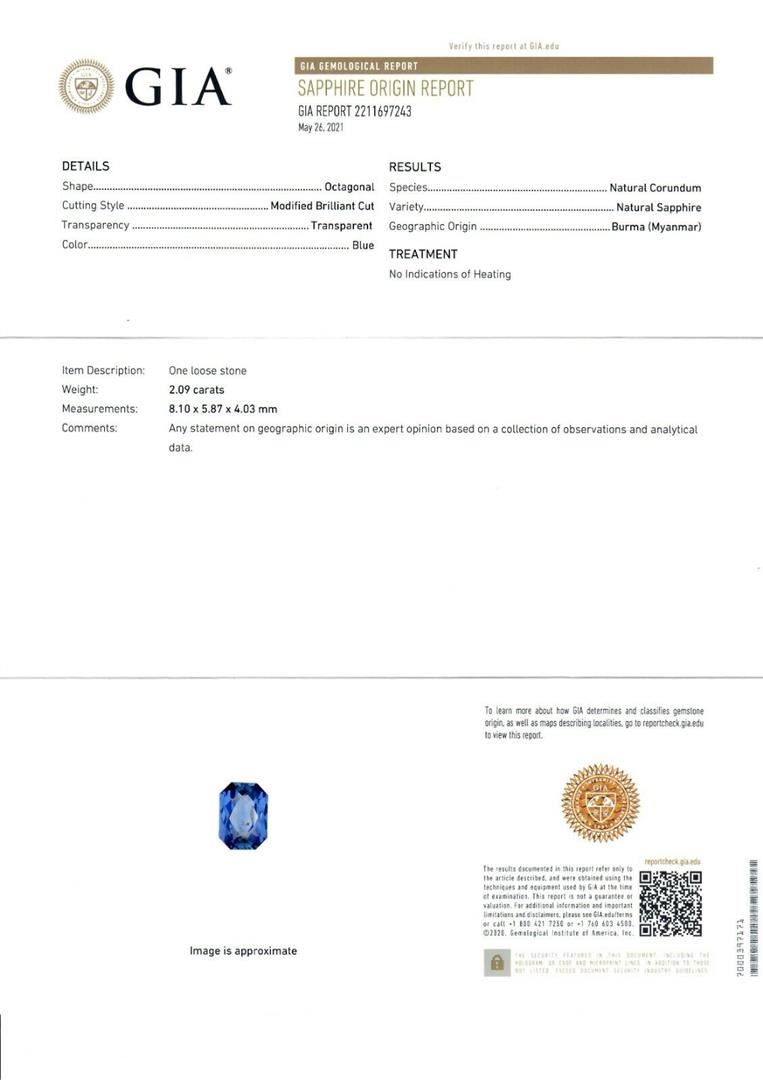 A solid platinum & 18k yellow gold balerrina ring, with 1 Gia certified octagonal cut natural burma sapphire (2.09ct ), and 20 baguette cut natural diamonds (E/F - VVS1/VVS2 ; 1.80ctw). The ring is size 7.0, weighs a total of 7.43 grams, and measures 14.8