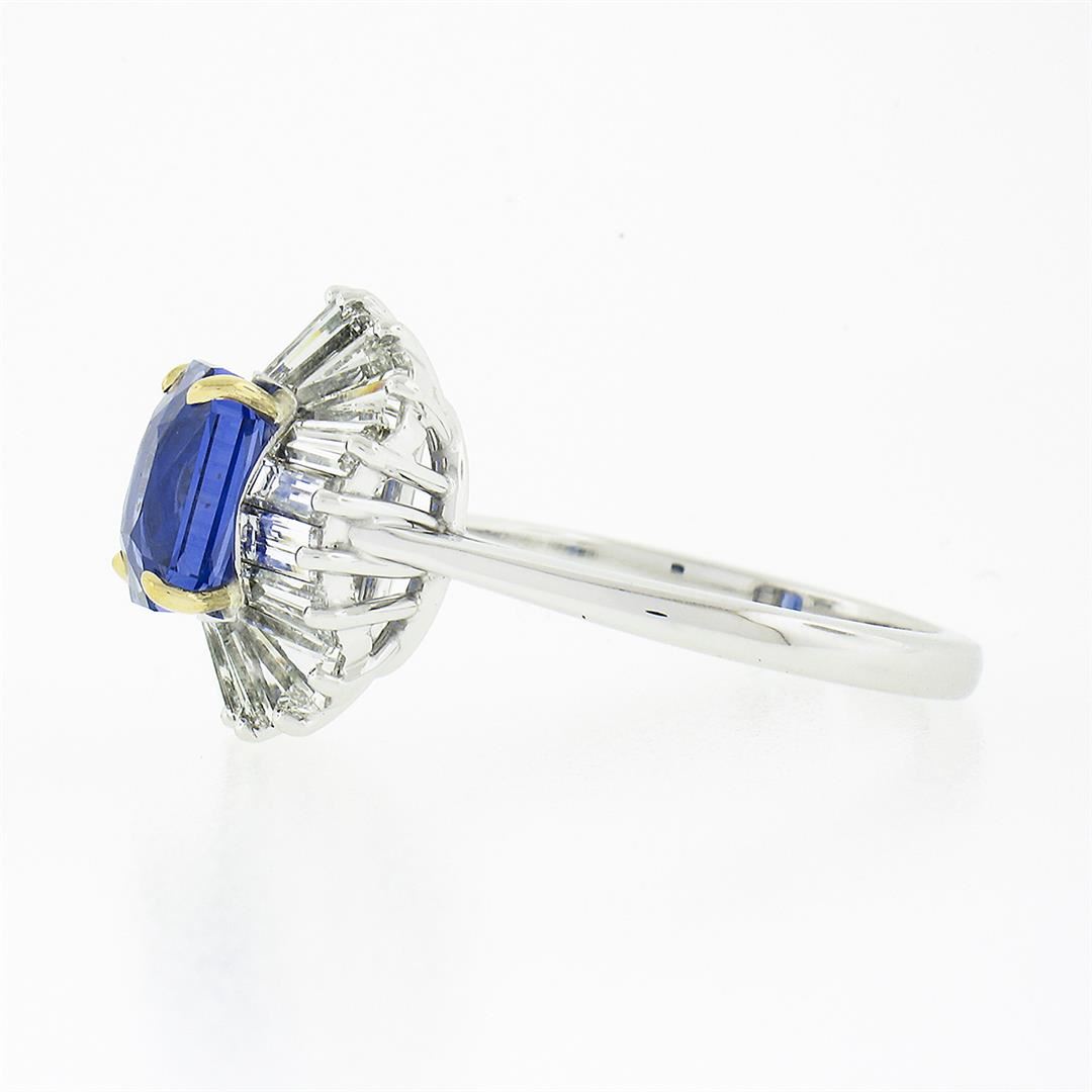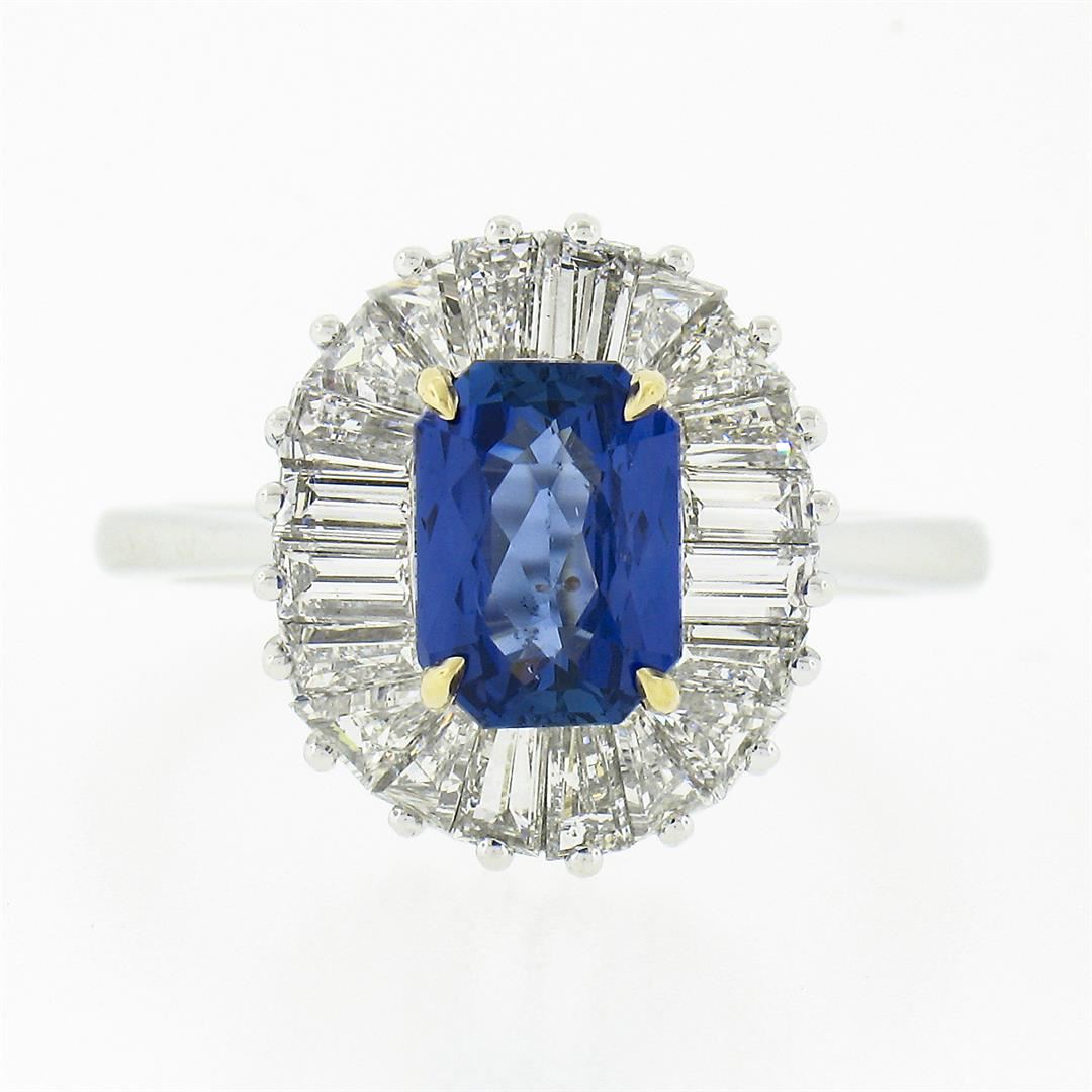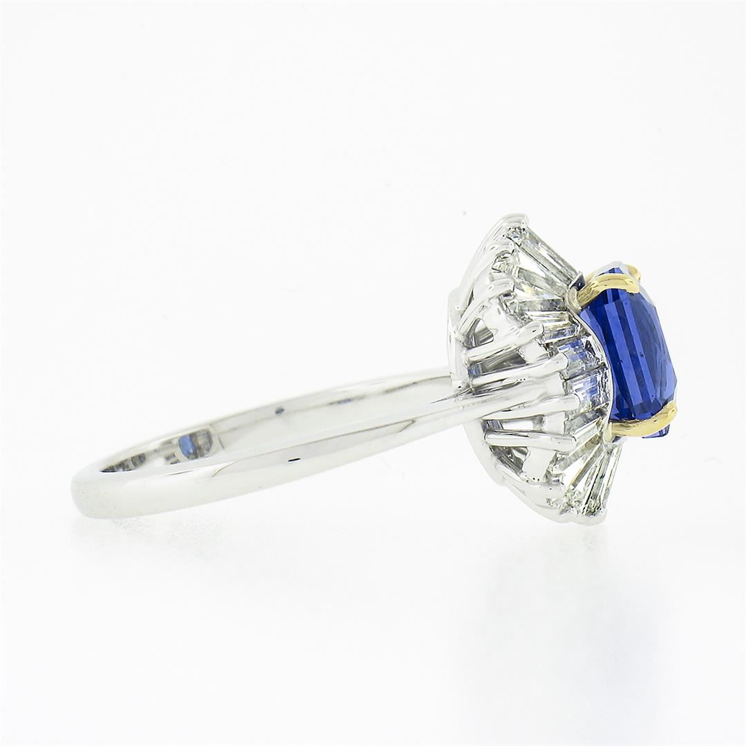 A solid platinum & 18k yellow gold balerrina ring, with 1 Gia certified octagonal cut natural burma sapphire (2.09ct ), and 20 baguette cut natural diamonds (E/F - VVS1/VVS2 ; 1.80ctw). The ring is size 7.0, weighs a total of 7.43 grams, and measures 14.8