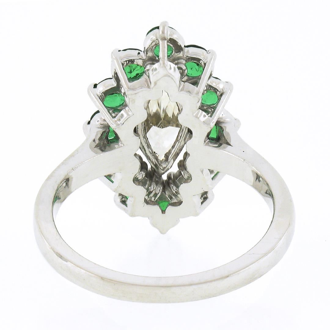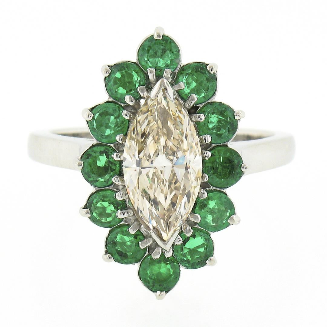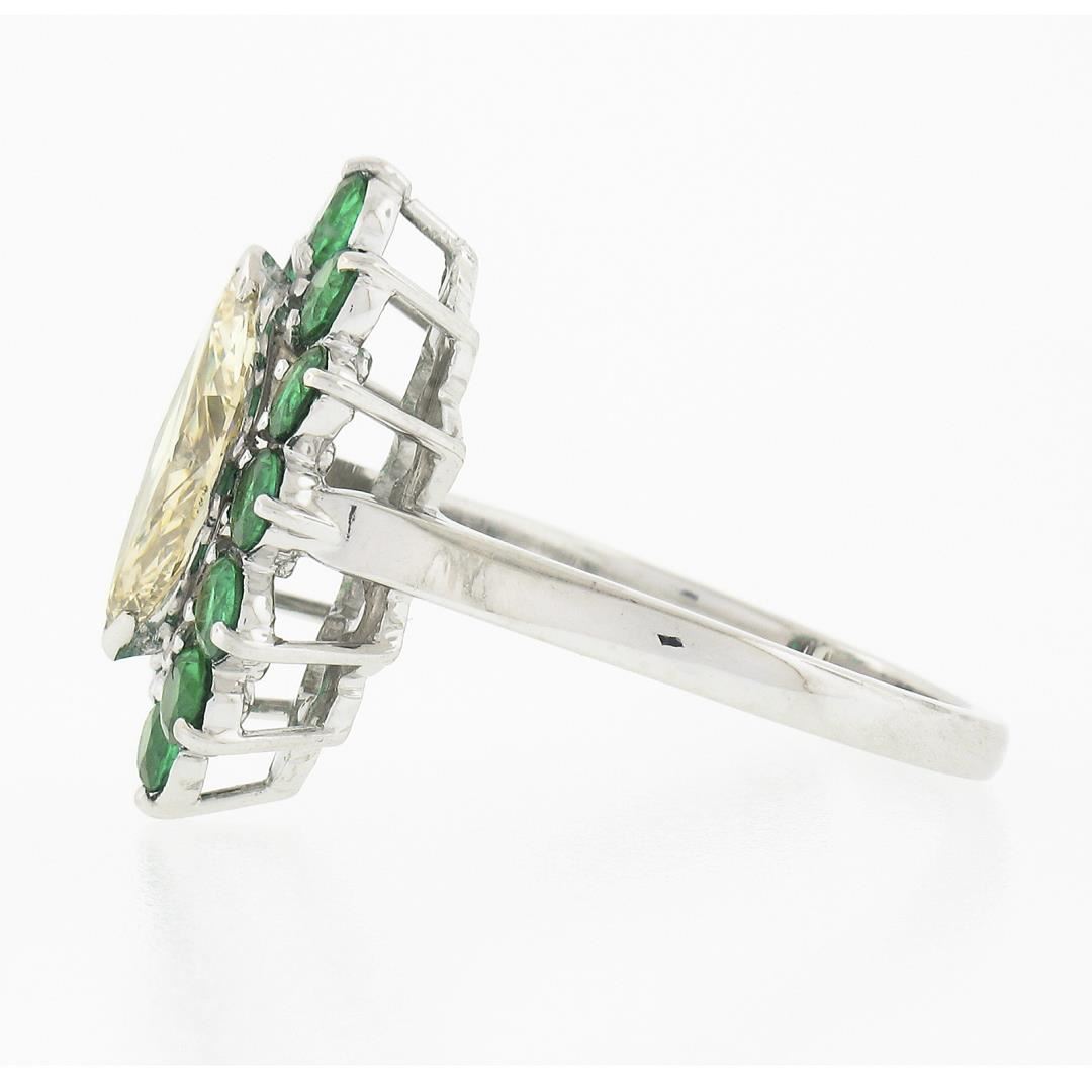 A solid platinum ring, with 1 marquise cut natural light yellow diamond (S/T - VS1 ; 1.10ct), and a halo of 12 round brilliant cut natural emeralds (1.20ctw ). The ring is size 5.5, weighs a total of 6.75 grams, and measures 18.9mm wide.