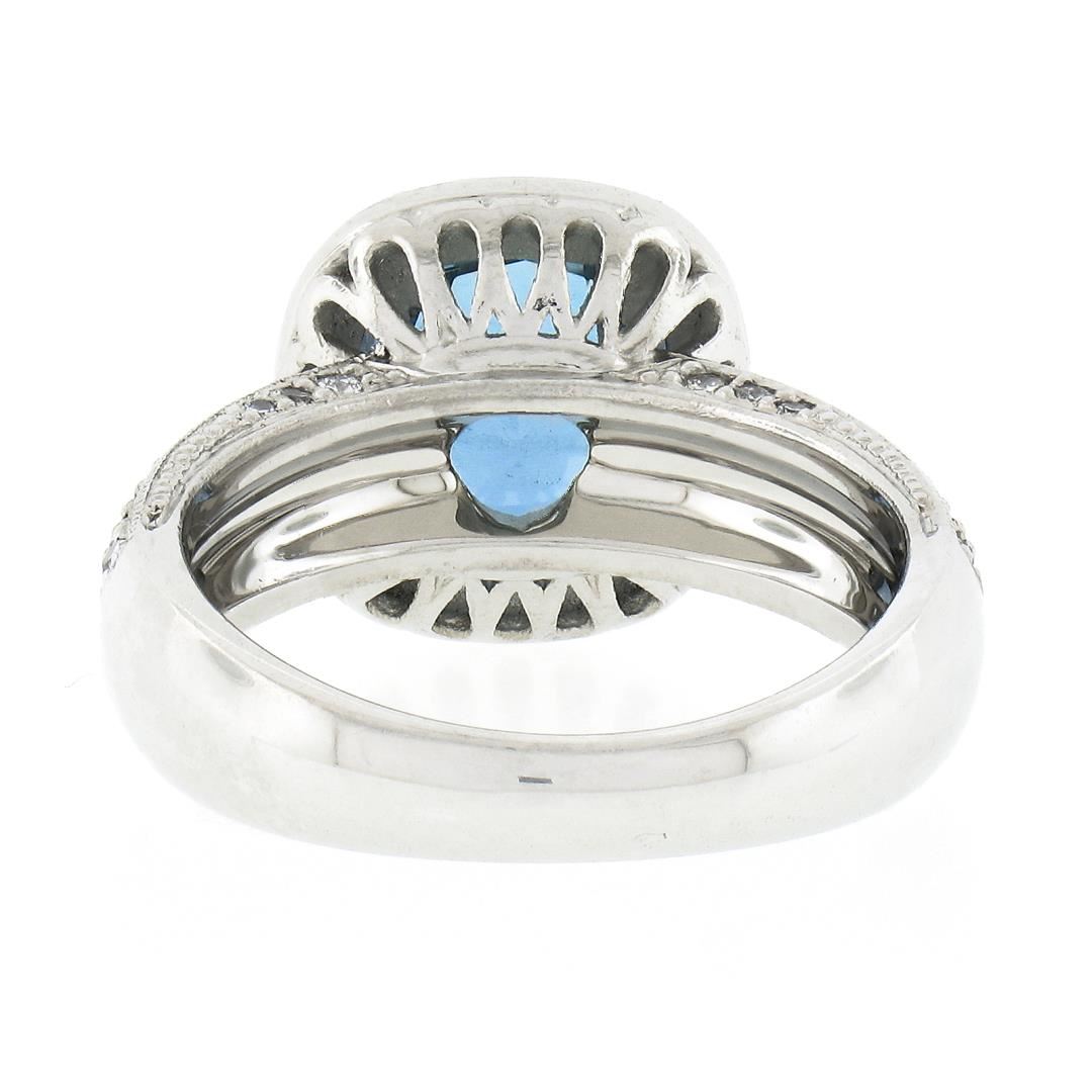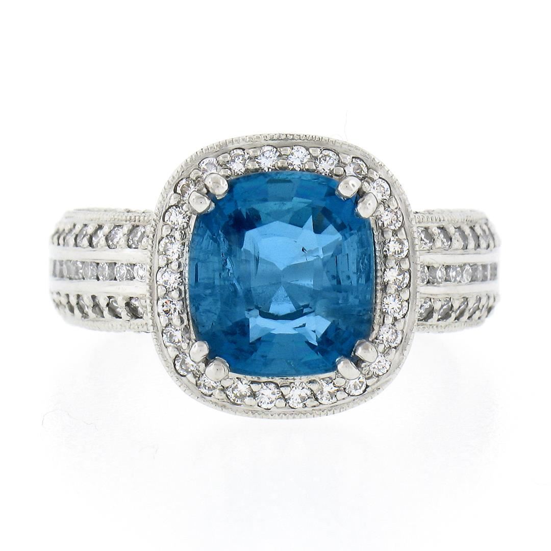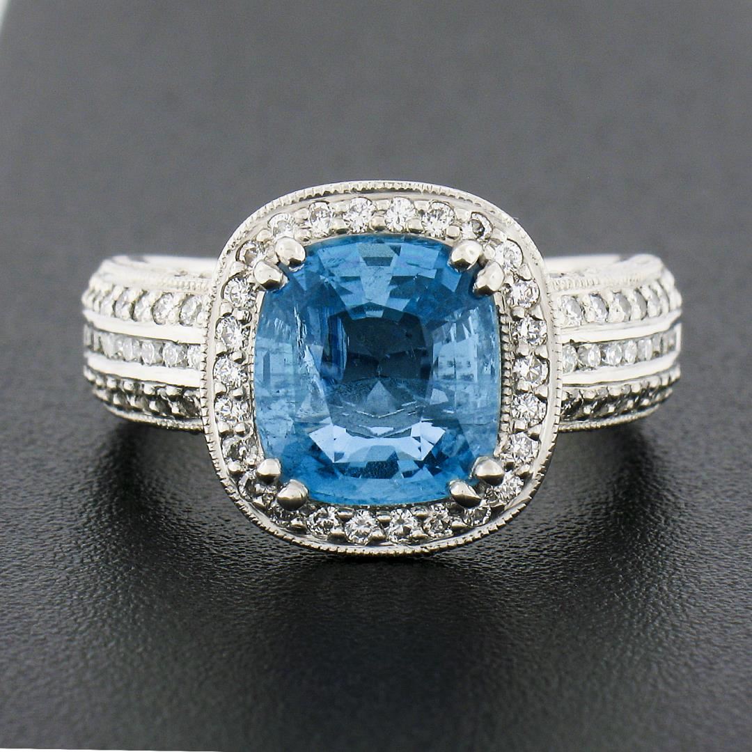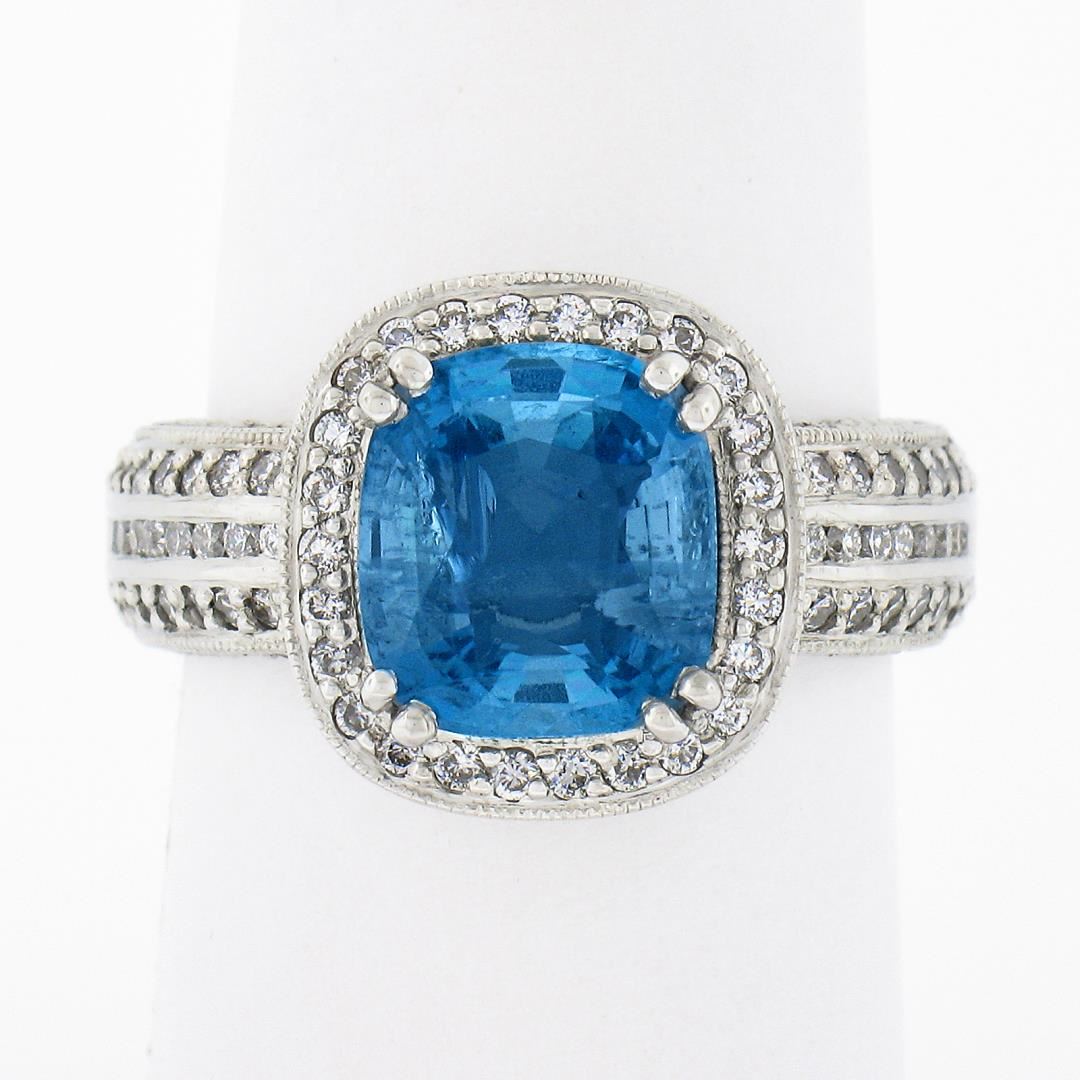A solid platinum ring, with 1 cushion cut natural aquamarine (2.58ct ), and a halo of 94 round brilliant cut natural diamonds (G/H - VS2 ; 1.0ctw). The ring is size 7.0, weighs a total of 12.25 grams, and measures 12.95mm wide.