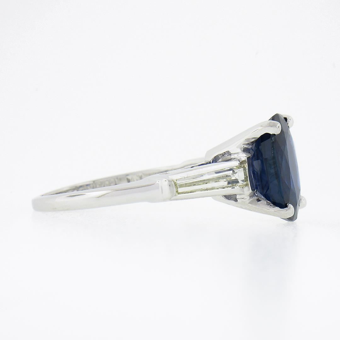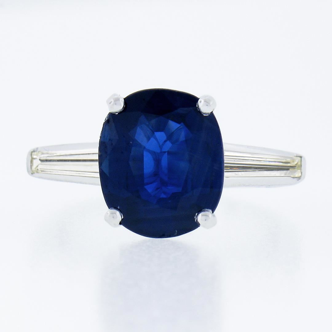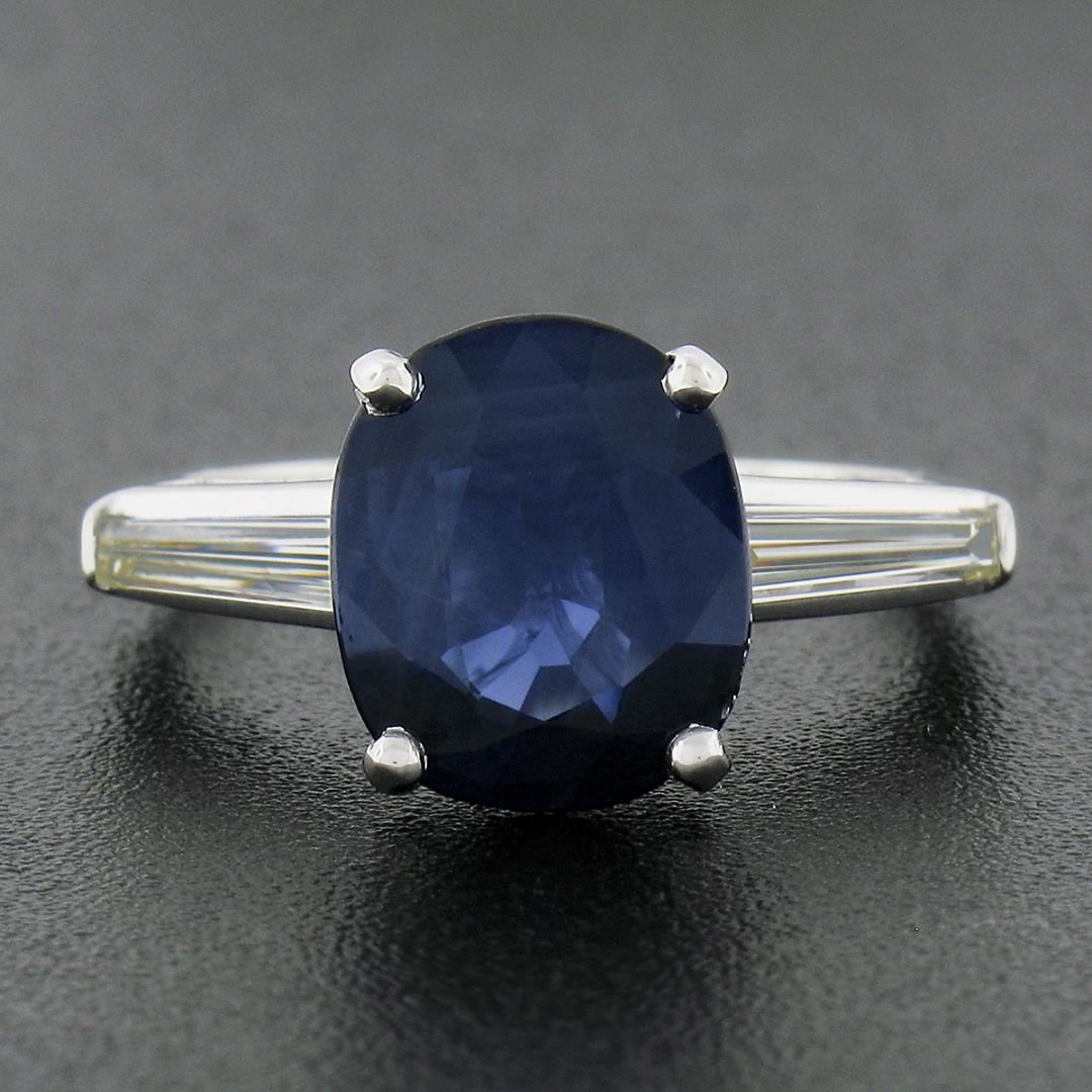 A solid platinum 3 stones ring, with 1 Gubelin graded 1 oval cut natural sapphire (3.64ct ), and 2 baguette cut natural diamonds (H/I - VS1/VS2 ; 0.60ctw). The ring is size 6.0, weighs a total of 5.26 grams, and measures 10.4mm wide. Comes with all original relevant certifications.