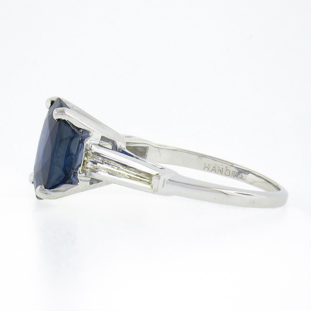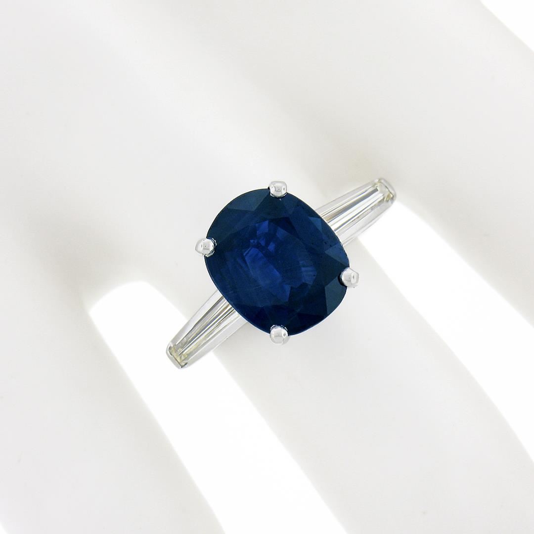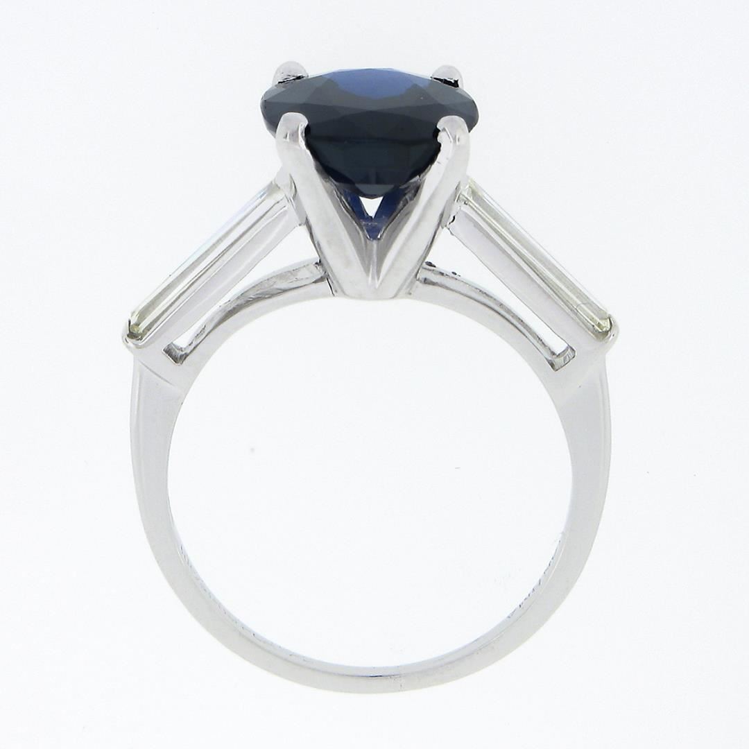 A solid platinum 3 stones ring, with 1 Gubelin graded 1 oval cut natural sapphire (3.64ct ), and 2 baguette cut natural diamonds (H/I - VS1/VS2 ; 0.60ctw). The ring is size 6.0, weighs a total of 5.26 grams, and measures 10.4mm wide. Comes with all original relevant certifications.