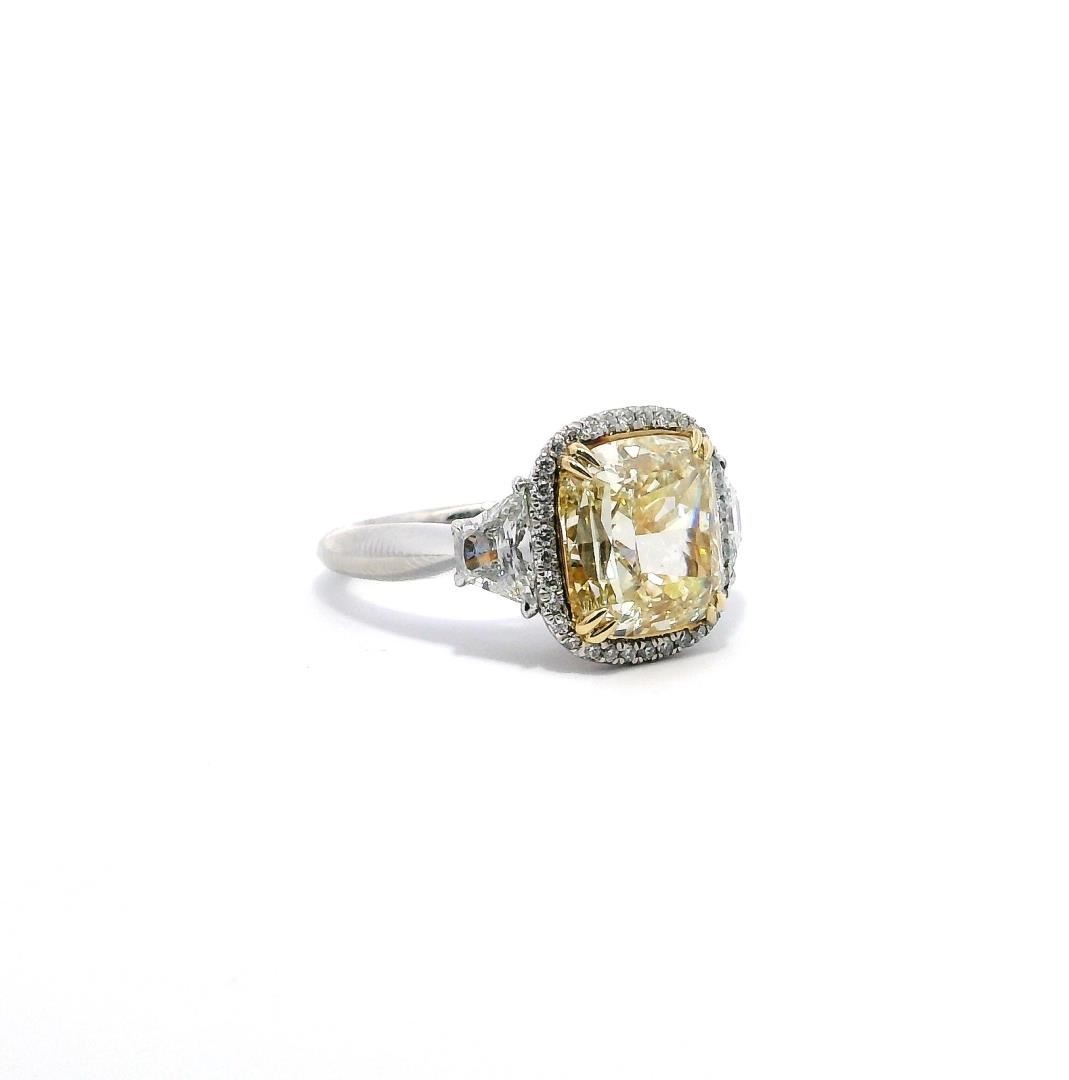 An extraordinary fusion of luxury, this platinum and 18kt yellow gold designer wedding ring features a breathtaking 5.90ct prong-set cushion-cut fancy intense yellow diamond, set in a yellow gold basket to enhance its vibrant hue. Flanking the center stone are two prong-set brilliant trapezoid cut diamonds (0.77ct total), offering a sleek and sophisticated transition. A halo of 34 prong-set round brilliant-cut diamonds (0.27ct total, F-G color, VS-1 to VS-2 clarity, Excellent cut) surrounds the center, adding brilliance. The cushion halo motif and 2.40mm shank width complete this opulent and timeless design.