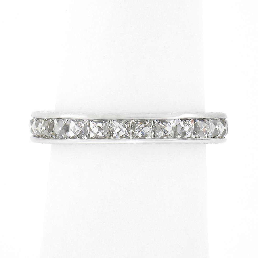A solid platinum eternity band ring, with 27 square French cut natural diamonds (E/F - VVS2/VS1; 3.0ctw). The ring is size 6.0, weighs a total of 4.13 grams, and measures 3.4mm wide.