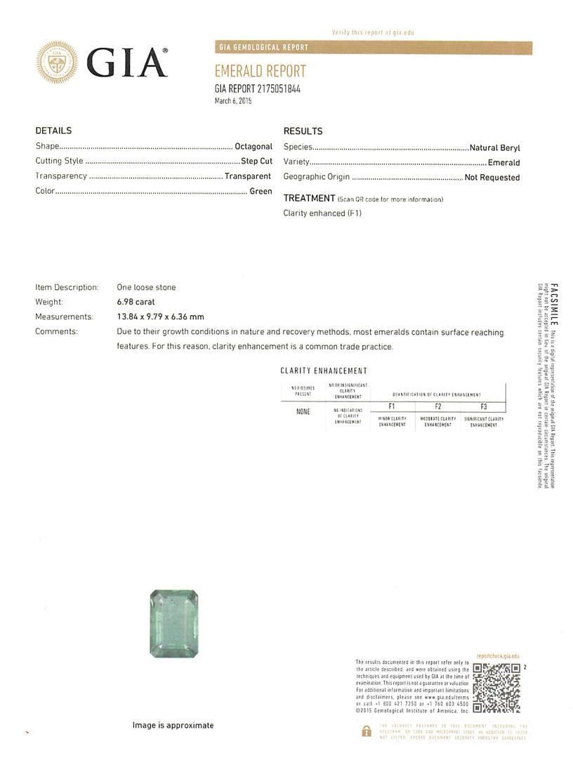 One electronically tested platinum ladies custom cast & assembled emerald and diamond pendant with chain. The pendant features an emerald set within tiered diamond bezels, completed by a diamond set bail. The pendant is supported by a twenty inch length 18KT white gold designer style chain, terminating in a lobster claw clasp. Bright polish finish. Identified with markings of "Pt900". Condition is new, good workmanship. Containing: One prong set octagonal step cut natural emerald, measuring 13.84 x 9.79 x 6.36mm, exact weight 6.98ct., clarity is moderately included, type III, medium dark, very slightly grayish, green color, (GIA G 6/3), cut is good. Transmitting light with a minimum of distortion, transparent. Naturally occurring internal & external characteristics are present. Clarity enhancement. GIA Gemological Report attached. Graded loose prior to setting in the GIA Laboratory, Report #2175051844.One Hundred Thirteen bead set round brilliant cut diamonds, measuring 1.60 - 1.40 x 0.90mm (depth est.) approximate total weight of 113 Stones = 1.40 ct. The color grade reflects the entire range of color for this group. Graded in the setting. Clarity: I-1 to I-2. Color: G - J Fifty-Two channel set baguette cut diamonds, measuring from 2.40 x 2.30 x 1.61mm (depth est.) to 3.50 x 2.20 x 1.54mm (depth est.) approximate total weight of 52 Stones = 2.90 ct. Graded in the setting. Clarity: SI-1 to I-1. Color: G - I. Total Weight of Colored Stones 6.98ct. Total Weight of Diamonds 4.30 ct. AIG Appraised.
