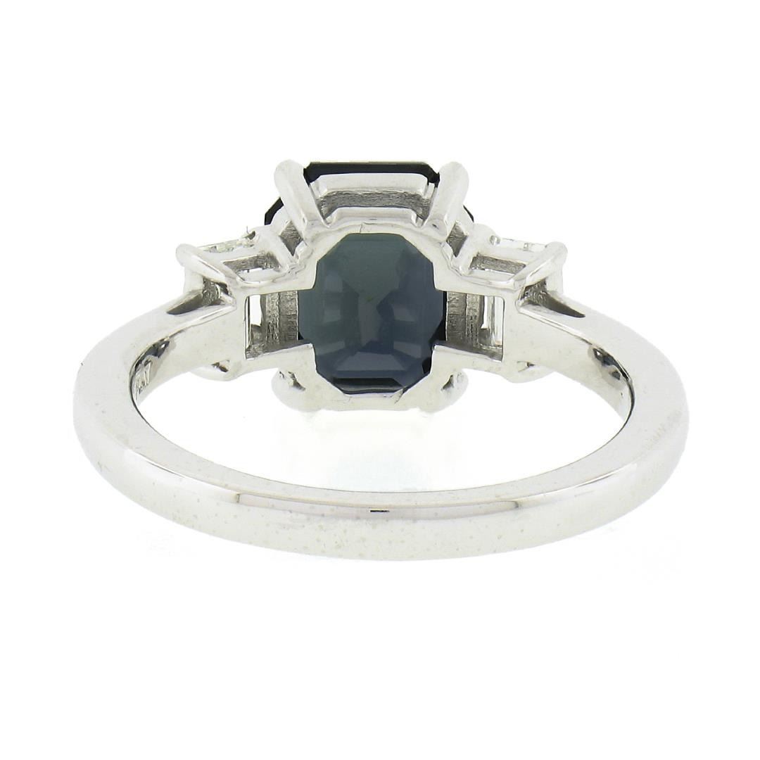 A new solid platinum ring, with 1 GIA graded octagonal cut natural sapphire (3.03ct ), and 2 emerald cut natural diamonds (G/H - VS1/VS2 ; 0.54ctw). The ring is size 6.5, weighs a total of 5.71 grams, and measures 9.2mm wide. Comes with all original relevant certifications.