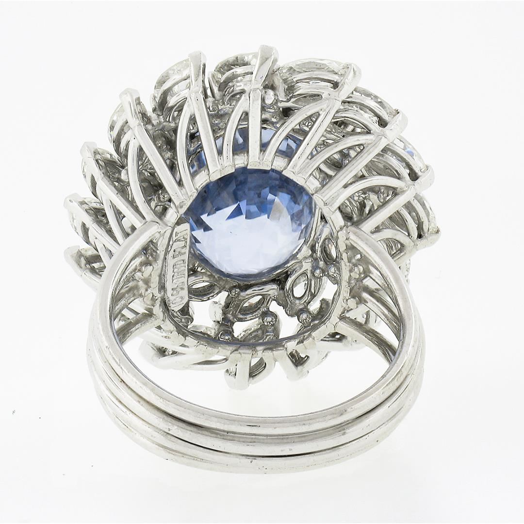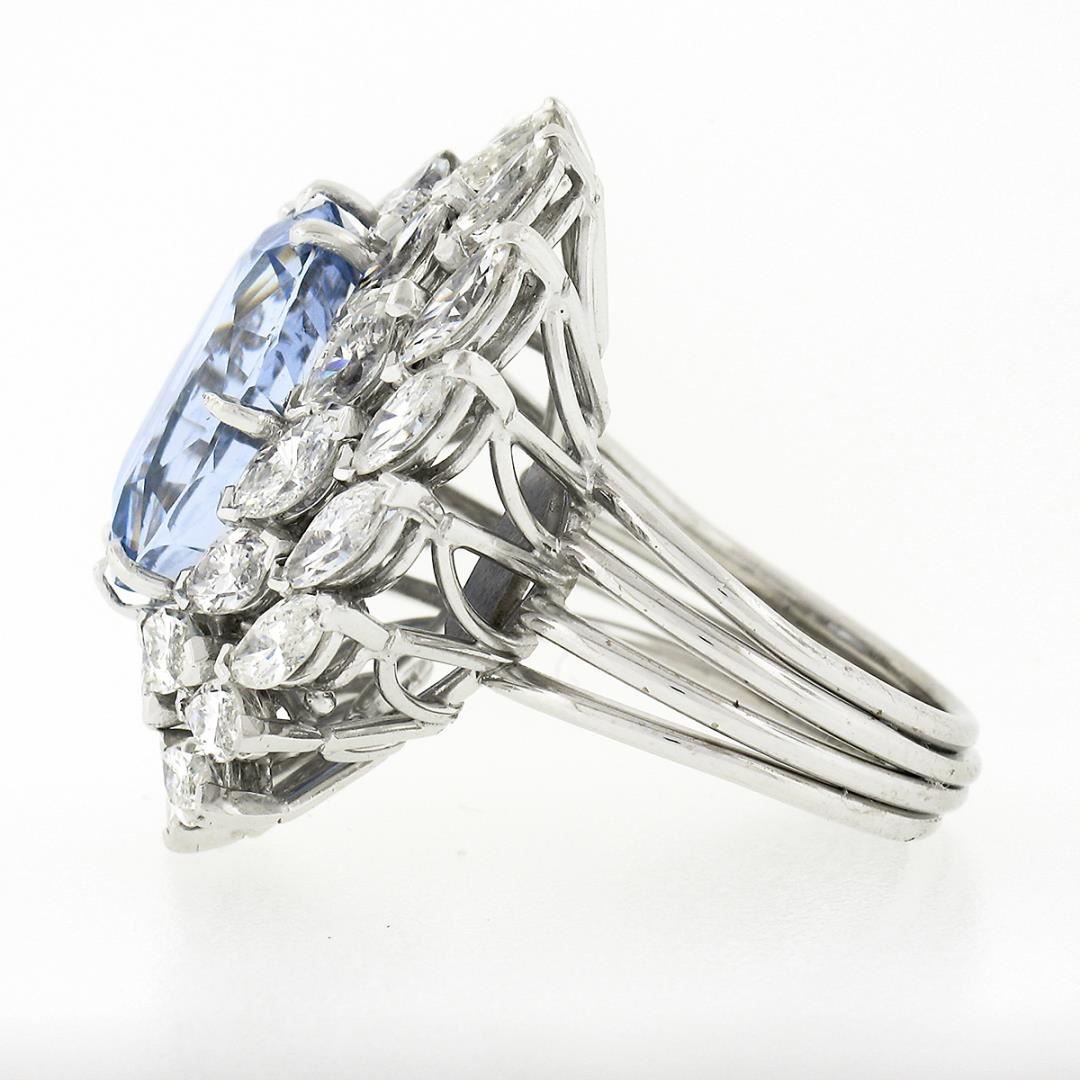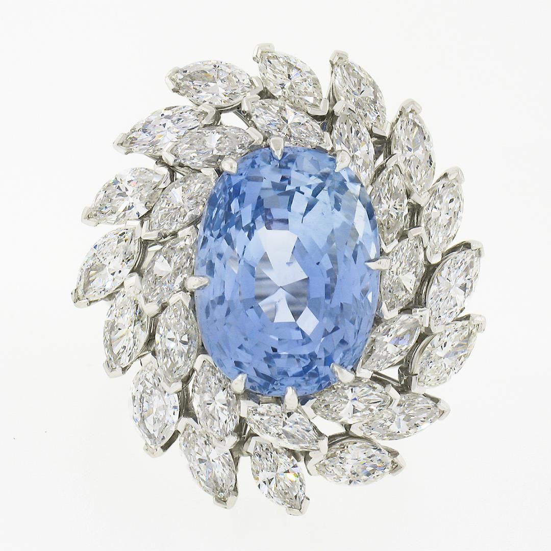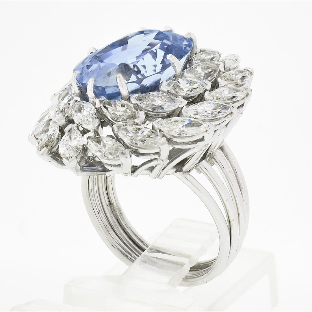 A solid platinum cocktail ring, with 1 GIA graded oval cut natural sapphire (12.90ct), surrounded with a halo of 28 marquise cut natural diamonds (G/H - VVS2/VS1 ; 4.50ctw). The ring is size 6.5, weighs a total of 17.05 grams, and measures 27.85mm wide.