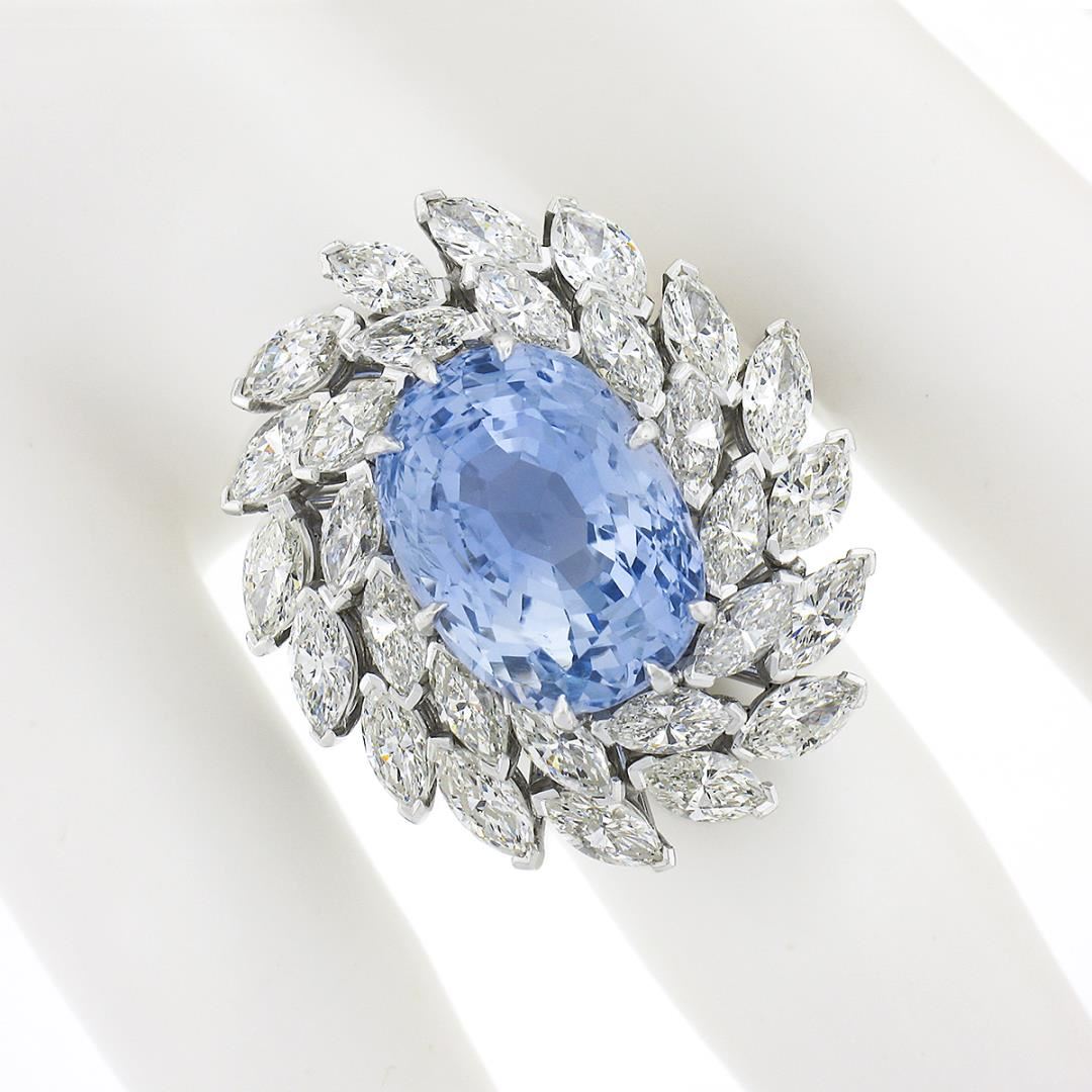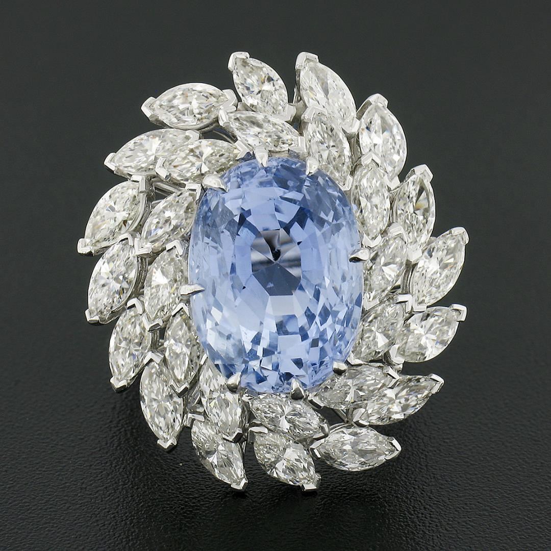 A solid platinum cocktail ring, with 1 GIA graded oval cut natural sapphire (12.90ct), surrounded with a halo of 28 marquise cut natural diamonds (G/H - VVS2/VS1 ; 4.50ctw). The ring is size 6.5, weighs a total of 17.05 grams, and measures 27.85mm wide.